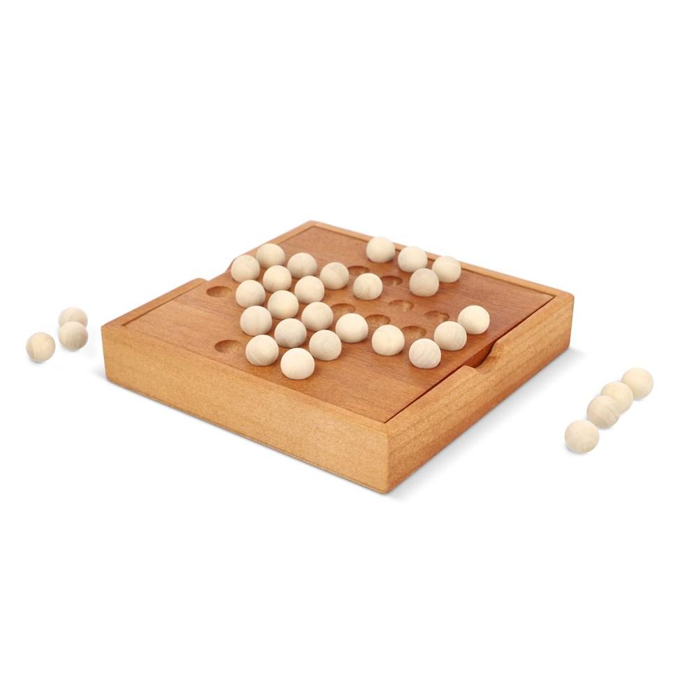 Deze houten solitaire-set met knikkers biedt een boeiende uitdaging voor spelers van alle niveaus. Speel alleen of wissel beurten af met anderen en bedenk strategisch hoe je zoveel mogelijk knikkers kunt verwijderen door er één over een andere te laten springen. De doos transformeert slim van opslagruimte naar speelbord.