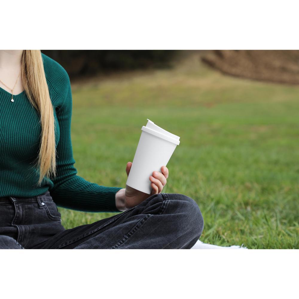 Royale meeneembeker van dubbelwandig kunststof inclusief opklikbaar deksel met drinkopening. Het deksel kan worden afgesloten met behulp van het flexibele lipje. Bovendien kan deze ook aan de rand van het deksel worden bevestigd. Past in alle gangbare bekerhouders in auto"s. Inhoud: 0,35 liter.