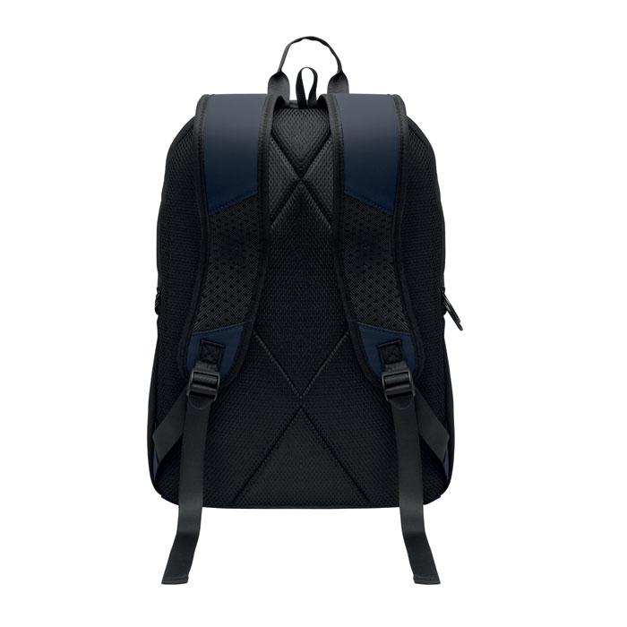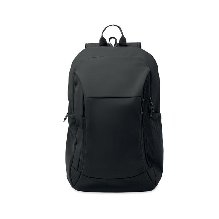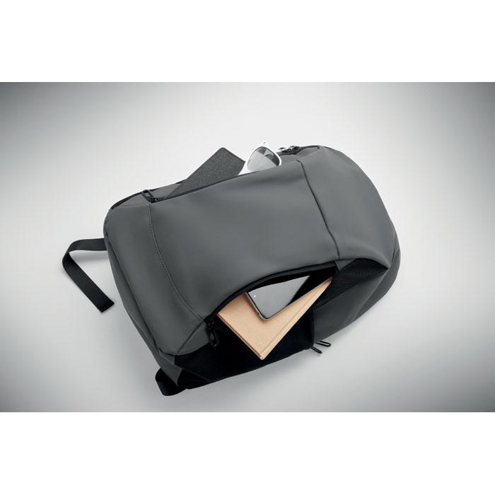 15 inch laptoprugzak van zacht PU met gewatteerde achterkant en verborgen hoofdvak met rits. 1 voorvak met rits, 2 zijvakken met rits aan de voorkant en 2 zijvakken van elastisch mesh. Met 210D RPET voering.