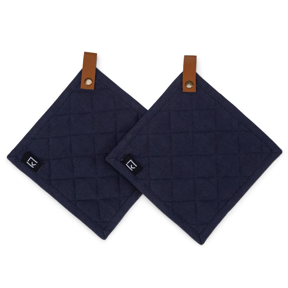 Pannenlappen in een 2-pack met een lus om op te hangen, gemaakt van zuiver katoen met Oeko-Tex keurmerk, veilig textiel. De pannenlappen zijn gewatteerd, gewatteerd en hebben een leuk detail in PU-leer om op te hangen.