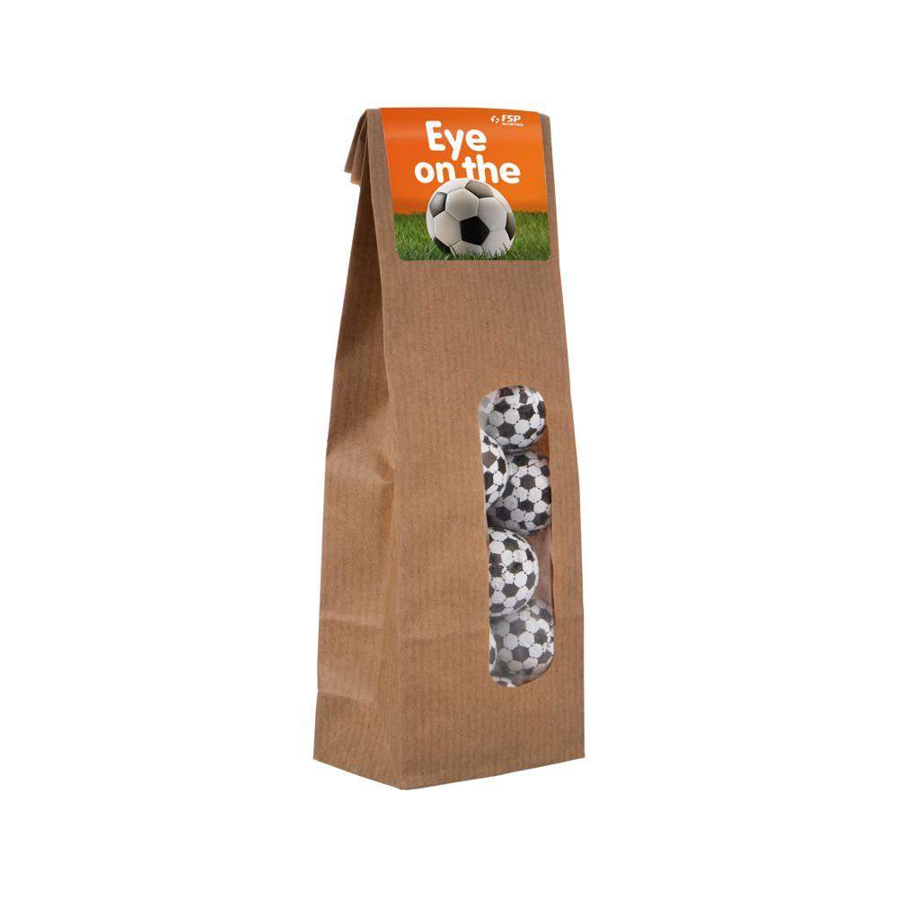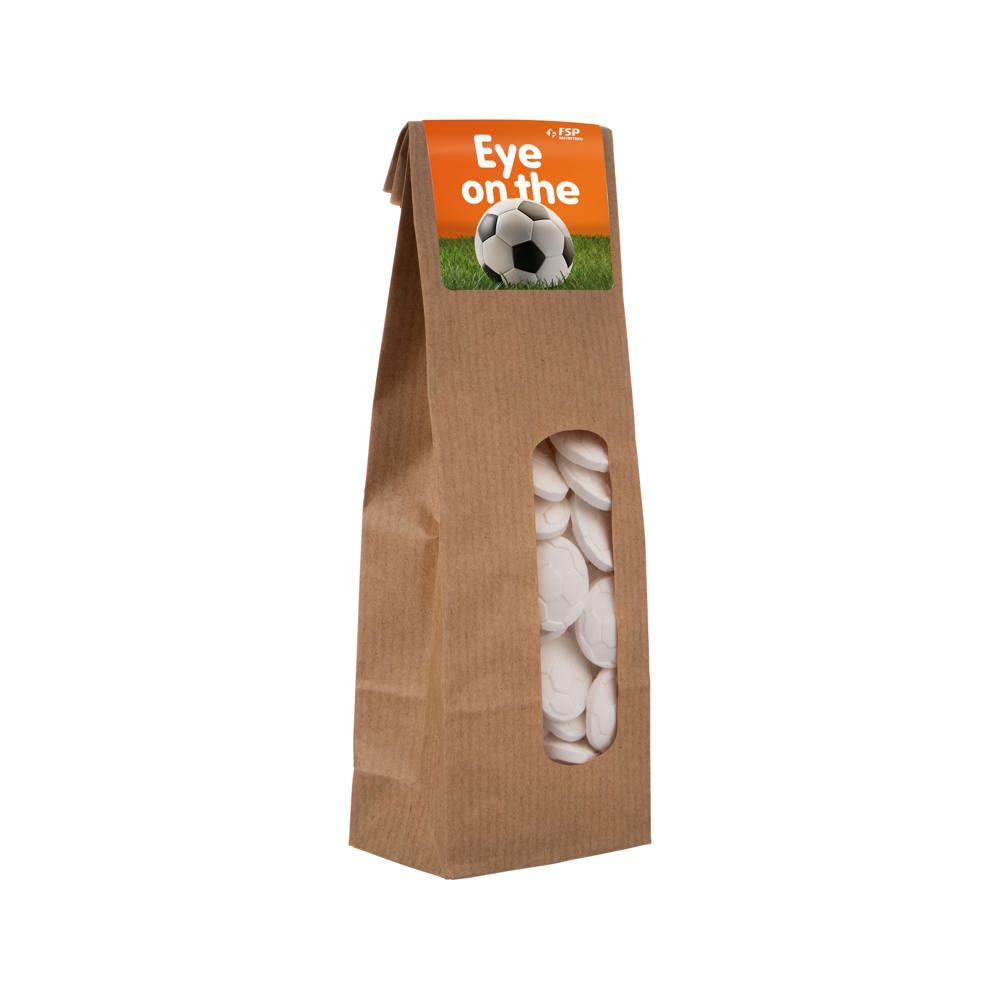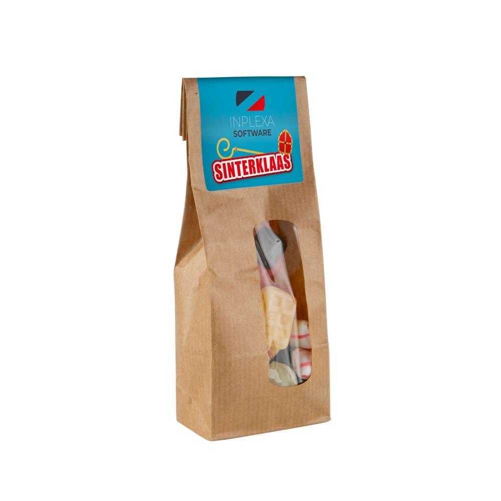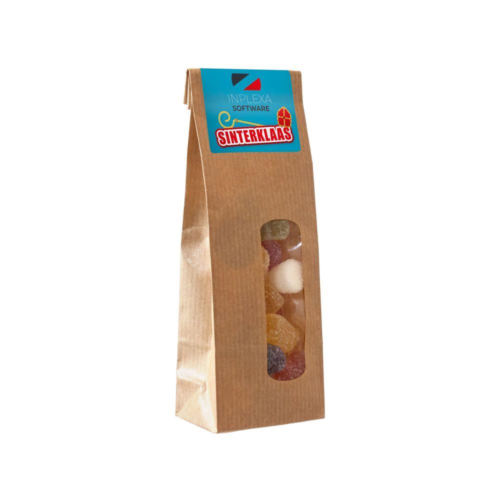 Kraftzakje met venster voorzien van een full colour sticker, gevuld met ca. 125 gram Dropstaafjes mix