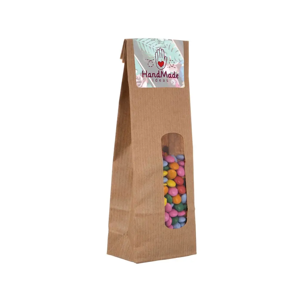 Ontdek dit praktische kraft zakje met venster, ideaal als relatiegeschenk voor uw bedrijf. Het is gevuld met ongeveer 125 gram dropstaafjes mix, verpakt in milieuvriendelijk kraft papier. Dankzij het transparante venster ziet uw ontvanger meteen de lekkere inhoud, wat de aantrekkelijkheid verhoogt.