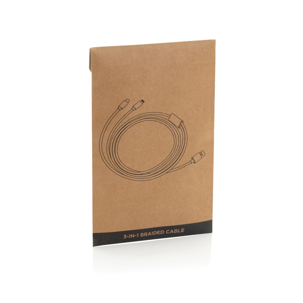 Luxe gevlochten 3-in-1 kabel met type C en dubbelzijdige connector voor iOS- en Android-apparaten die micro-USB nodig hebben. Gevlochten nylon materiaal met connectors gemaakt van duurzaam aluminium. Geschikt voor opladen. Lengte 120 cm.