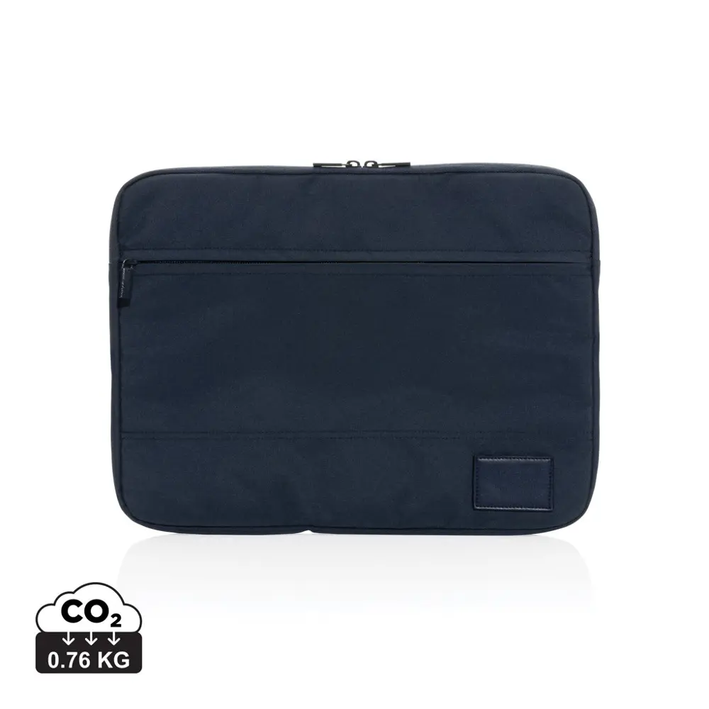 Bescherm uw 14 inch laptop op een elegante manier met deze praktische hoes. Het strakke ontwerp biedt voldoende ruimte voor uw apparaat, terwijl het ruime voorvak extra opbergmogelijkheden creëert voor accessoires zoals laders of notitieblokken. Gemaakt van 300D gerecycled polyester, combineert deze hoes functionaliteit met een modern uiterlijk dat perfect past bij uw bedrijfsimago.