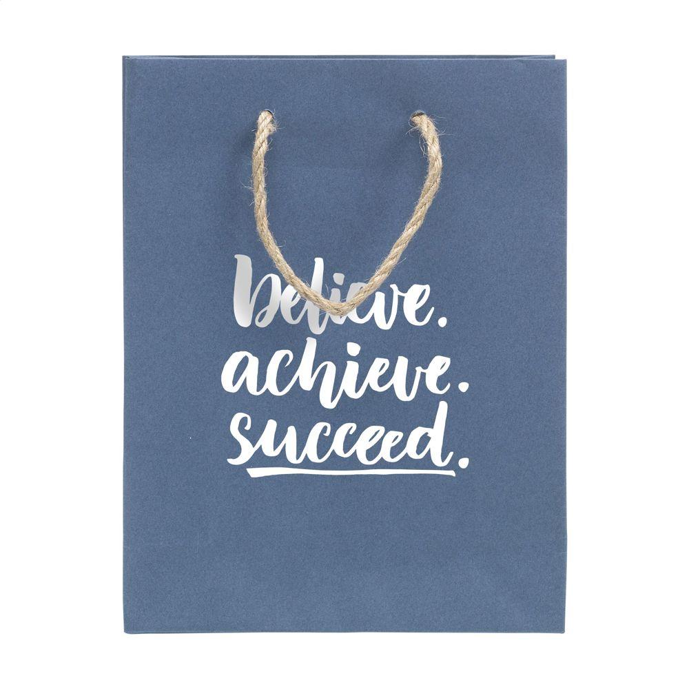Ontdek deze duurzame geschenktas in maat S, gemaakt van gerecycled papier met jeansvezels (180 g/m²). Je kiest voor een milieuvriendelijk alternatief zonder bomenkap, ideaal als gepersonaliseerd relatiegeschenk met jouw logo.
