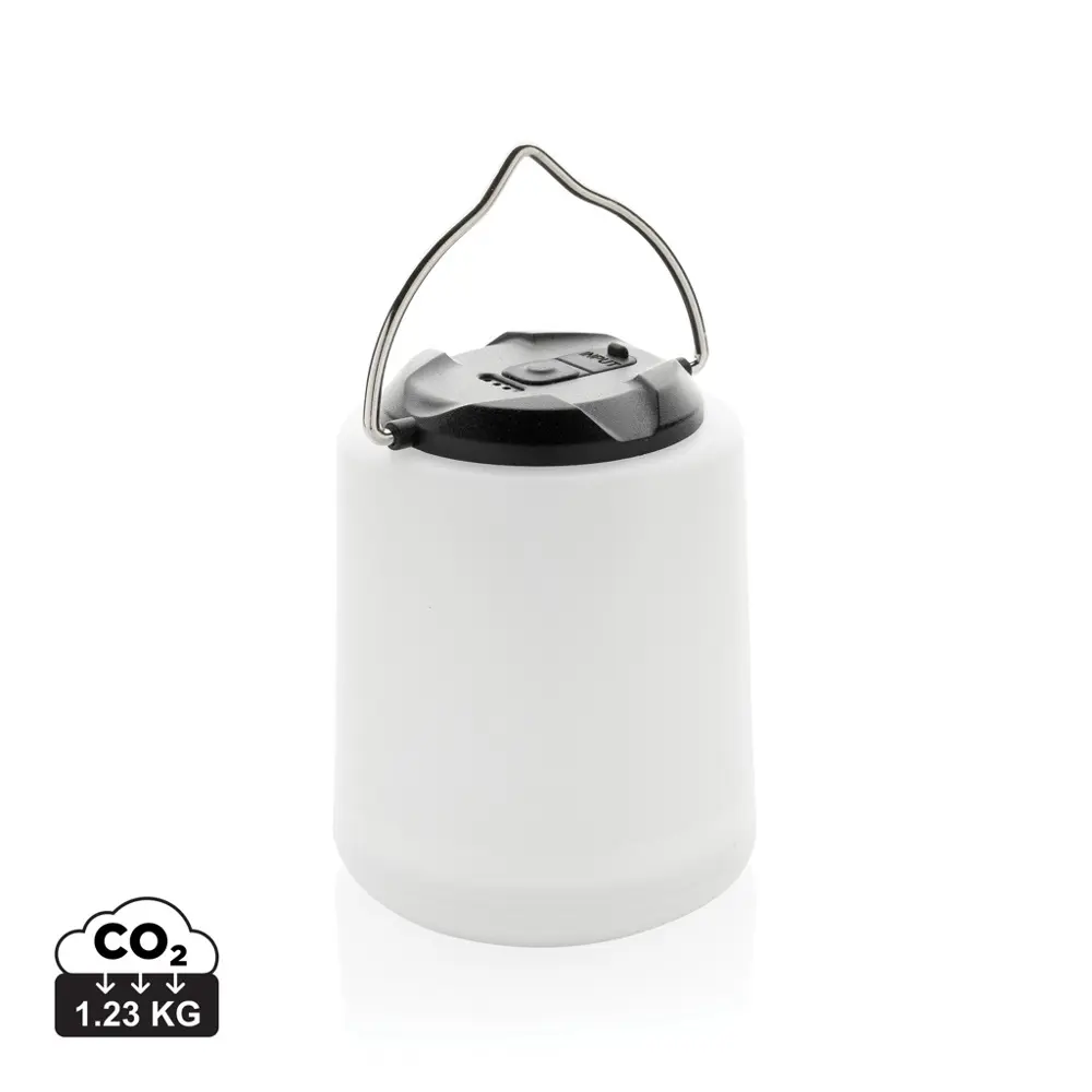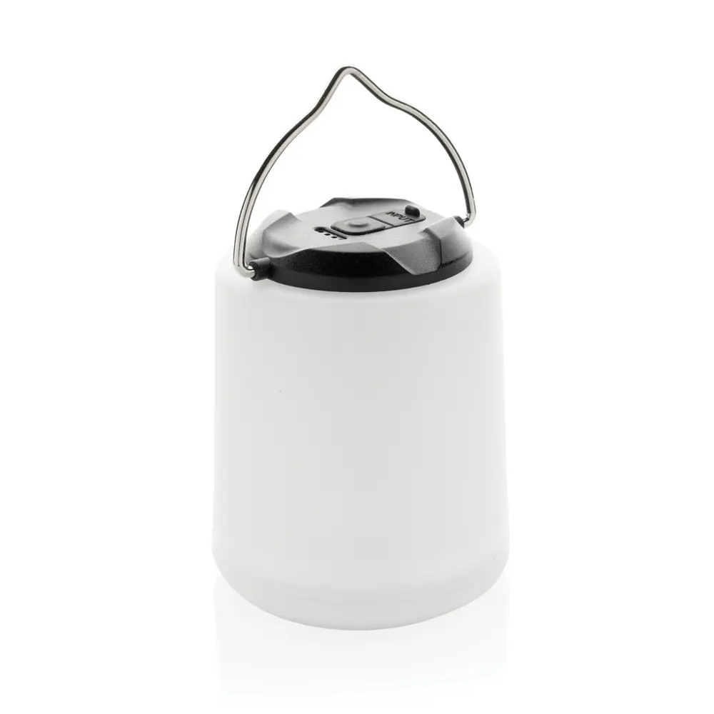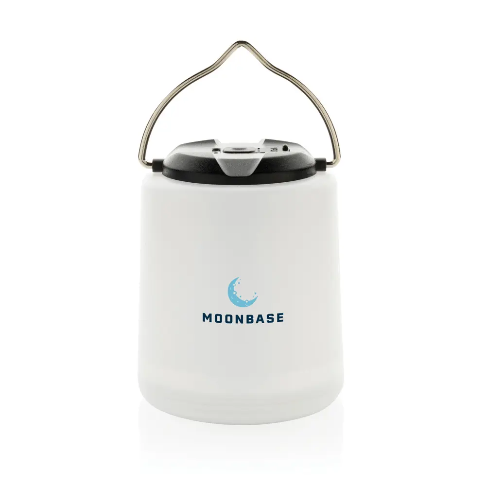 De Limio RCS draagbare oplaadbare tafellamp uit gerecycled plastic biedt u een duurzame en veelzijdige verlichtingsoplossing voor binnen- en buitengebruik. Perfect als gepersonaliseerd relatiegeschenk met uw logo, ideaal voor events en marketingacties, zodat u uw merk zichtbaar maakt bij uw klanten. De lamp staat stevig op tafel of hangt op, met een oplaadbare Li-ion batterij via USB-C voor tot 4 uur licht en een snellading in 2 uur. De LED-bron levert tot 300 lumen in drie standen: sterk, gedimd of knipperend, afgestemd op elke behoefte.