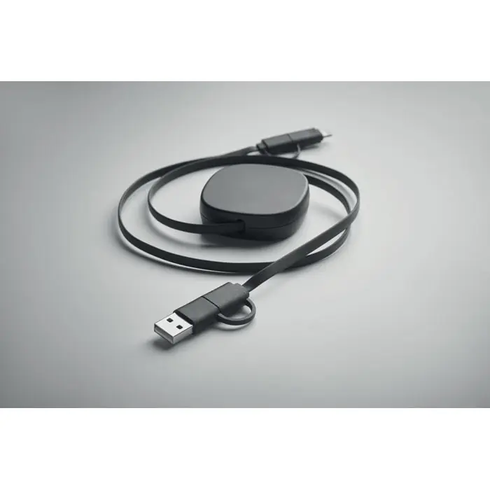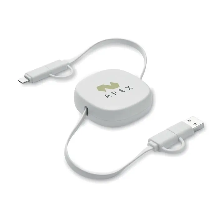 Deze oplaadkabel is meer dan een accessoire; het is een slimme manier om uw merk zichtbaar te maken. Het intrekbare ontwerp houdt alles ordelijk en professioneel, terwijl de veelzijdige connectors ervoor zorgen dat uw klanten altijd klaar zijn voor opladen, ongeacht hun apparaat. Door te kiezen voor gerecycled materiaal toont u commitment aan duurzaamheid, wat uw imago bij milieubewuste doelgroepen versterkt. Personaliseer het met uw logo om een blijvende indruk te maken tijdens events of als relatiegeschenk – uw merk blijft zo top-of-mind bij ontvangers.