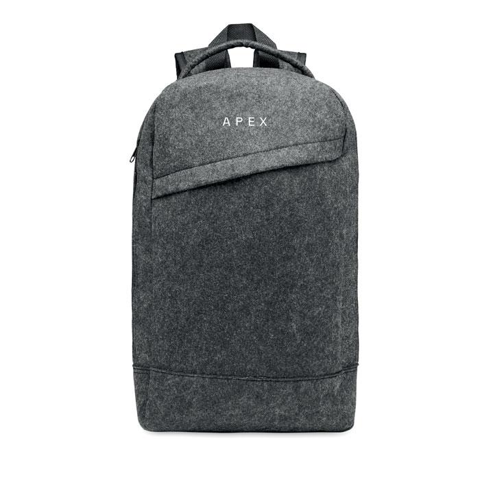 13-inch laptoprugzak van RPET-vilt met gewatteerde schouderband, riem en binenin een hoofdcompartiment. Afsluitbaar vak met rits aan de binnenkant. Trolleyhouder aan de achterzijde.