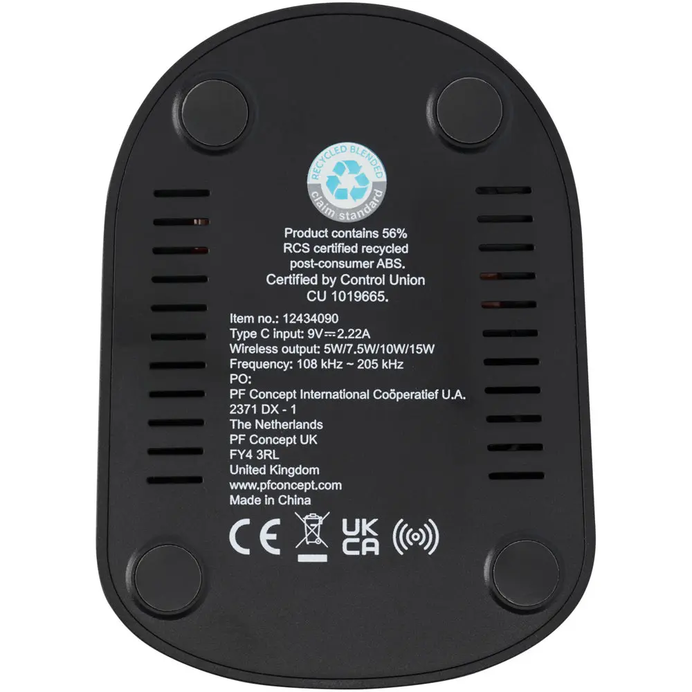 Ontdek ons draadloos dual coil laadstation van 15 W, vervaardigd uit RCS-gerecycled plastic. Dit compacte apparaat, met afmetingen van 7 x 10,4 x 9,6 cm, biedt een robuuste oplossing voor uw marketingacties en events. Dankzij de antislip rubberen voet blijft het stevig op zijn plaats, ideaal voor dagelijks gebruik op bureaus of nachtkastjes.