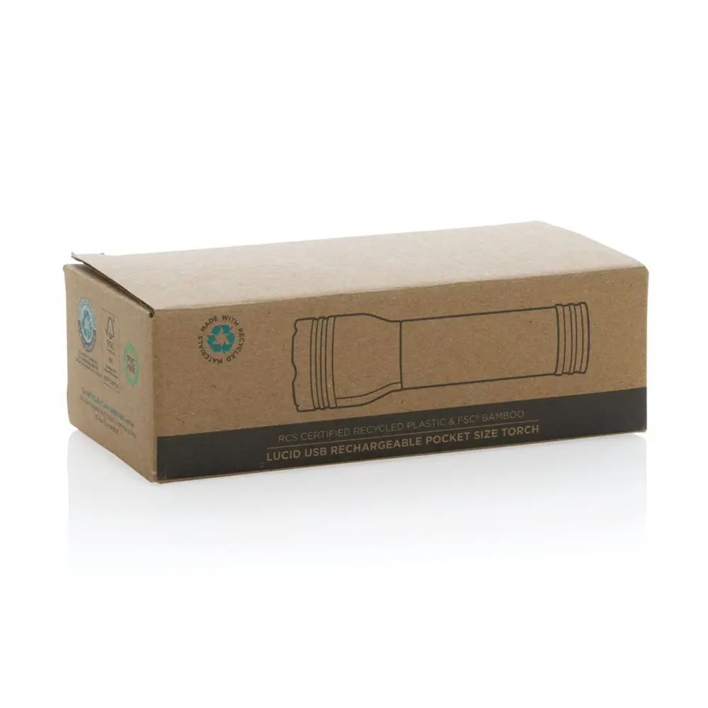 Ontdek de Lucid 1W bamboe zaklamp, een ideaal gepersonaliseerd relatiegeschenk voor uw marketingcampagnes of events. Gemaakt van FSC®-gecertificeerd 100% bamboe en RCS-gecertificeerd gerecycled ABS met 23% gerecyclede inhoud, voldoet dit product aan strenge milieunormen en versterkt uw duurzame imago bij klanten.