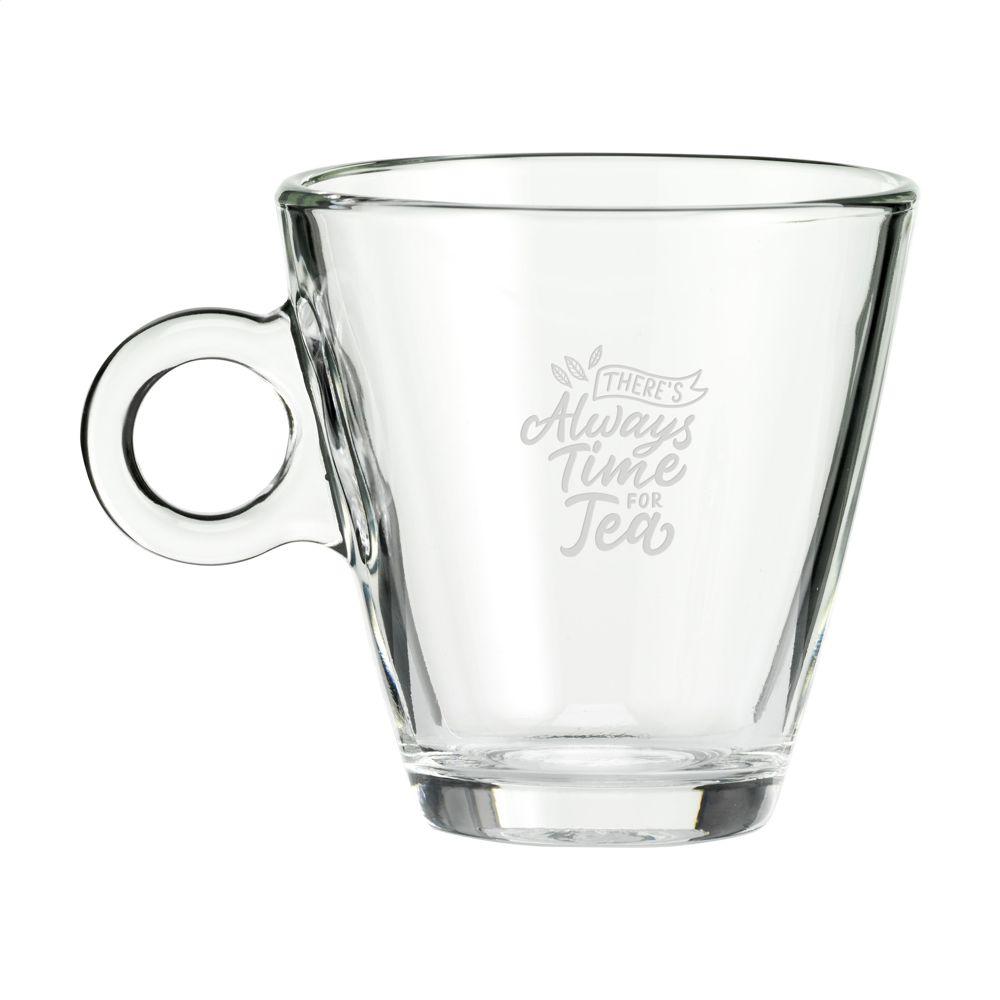 Je zoekt een stijlvol relatiegeschenk dat indruk maakt? Dit grote theeglas van hoogwaardig, gehard glas is perfect voor jouw events en marketingacties. Het tijdloze model met opvallend rond oor ligt prettig in de hand en heeft een inhoud van 320 ml – ideaal voor thee of andere warme dranken. Met een diameter van 90 mm staat het stevig en elegant op tafel.
