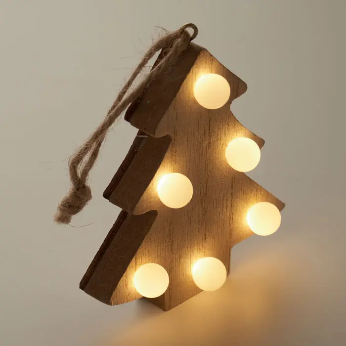 Ontdek de LULIE - Houten boom met lichtjes, een ideaal gepersonaliseerd relatiegeschenk voor uw marketingcampagnes of events. Gemaakt van 80% populier en 20% resthout, biedt dit duurzame, bio-vriendelijke product een warme uitstraling met zes geïntegreerde LED-lampjes en een handig ophangkoord. Inclusief één CR2032-batterij voor direct gebruik.