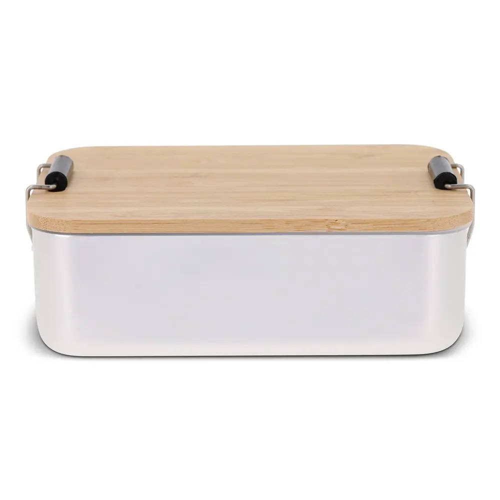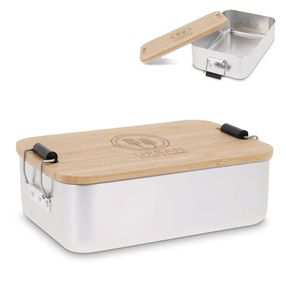 Het robuuste aluminium behoudt de versheid van uw maaltijden, terwijl het bamboe deksel een natuurlijke touch toevoegt. Voor uw bulkbestellingen personaliseren wij deze lunchbox moeiteloos met uw branding, geschikt voor grootschalige uitdelingen aan uw doelgroep. Zo creëert u een blijvende indruk bij marketingacties of bedrijfsrelaties.