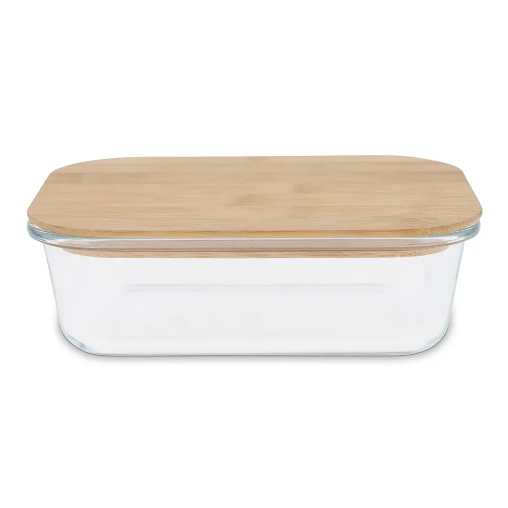Ontdek onze glazen lunchbox met bamboe deksel, een ideaal relatiegeschenk voor uw marketingcampagnes en events. Met een volume van 1000 ml biedt deze duurzame lunchbox voldoende ruimte voor maaltijden of snacks, en houdt het eten vers dankzij de luchtdichte afsluiting. Het bamboe deksel en bio-materiaal zorgen voor een milieuvriendelijke keuze die uw merkeco-responsabiliteit benadrukt.