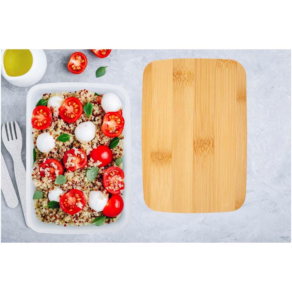 Je kiest met deze lunchtrommel voor een milieuvriendelijk relatiegeschenk gemaakt van gerecycled plastic met een inhoud van 500 ml. Het bamboe deksel en het stevige elastiek houden je eten vers en veilig op zijn plaats, ideaal voor dagelijks gebruik.