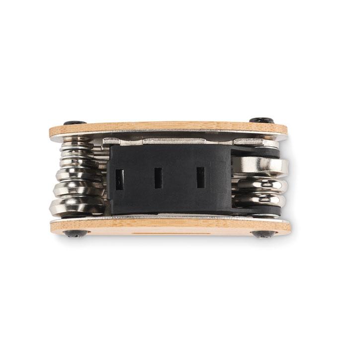 Multifunctioneel roestvrijstalen multi-tool met bamboe behuizing. 11 functies. Inclusief: inbussleutels, platte moersleutel, hulsverlenger, kruiskopschroevendraaier en dopsleutel.