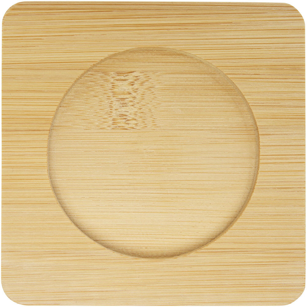 De bamboe onderzetter (10 x 10 x 1 cm) voegt functionaliteit toe en beschermt oppervlakken. Verpakt in een individuele giftbox, klaar voor uitdeling. Kies voor kwaliteit en duurzaamheid om uw marketingstrategie te boosten.