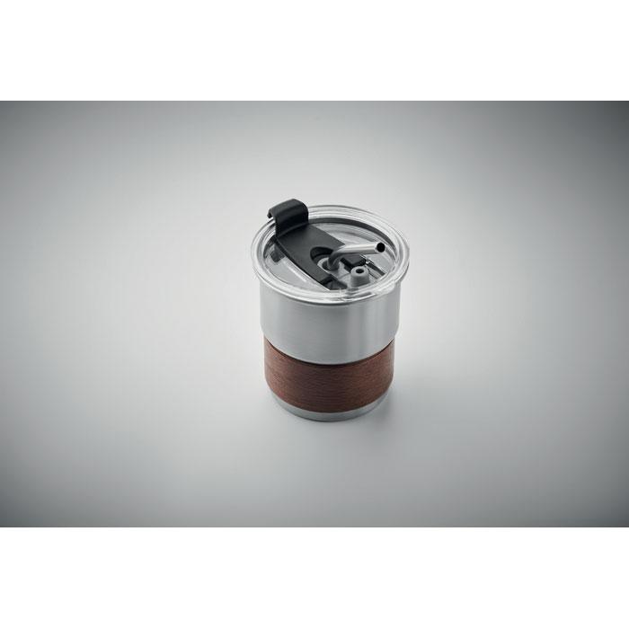 Enkelwandige beker van gerecycled roestvrij staal (90% gerecycled roestvrij staal en 10% roestvrij staal) met afneembare handgreep van acaciahout, rietje van roestvrij staal. Rietjesopening en lekvrij deksel met directe drinkopening. Inhoud: 260ml. Bij enkelwandige bekers kan er warmteoverdracht plaatsvinden.