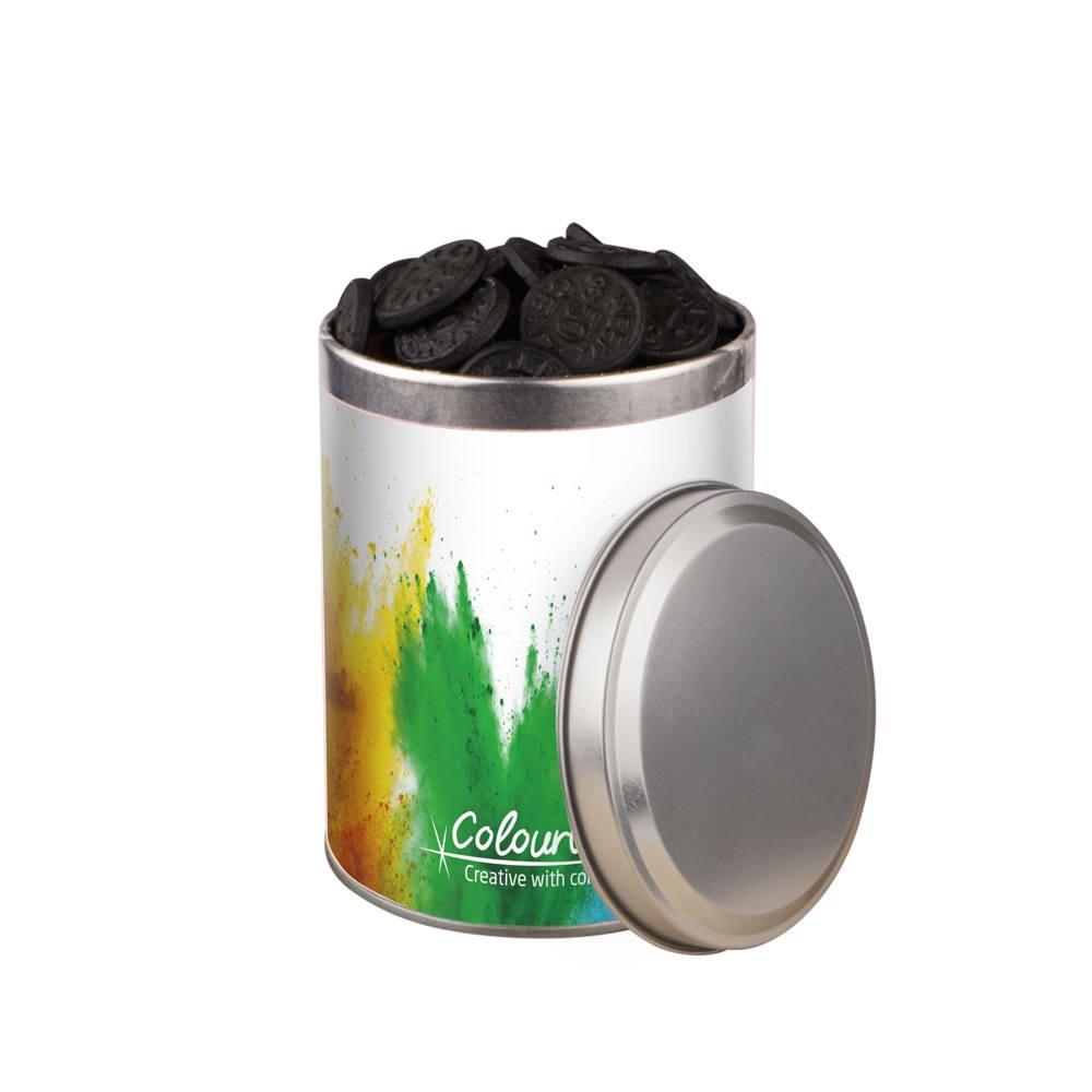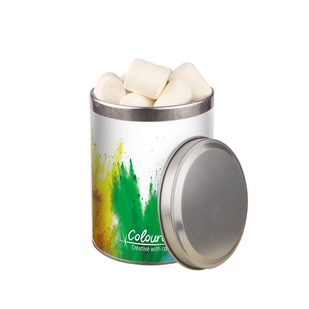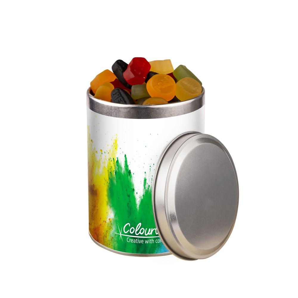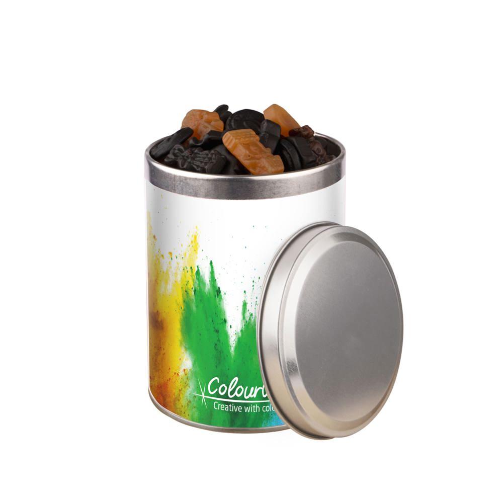 Medium rond blik, 0,9 liter gevuld met ca. 300 gram Metallic Sweets mix en voorzien van een full colour bedrukte sleeve
