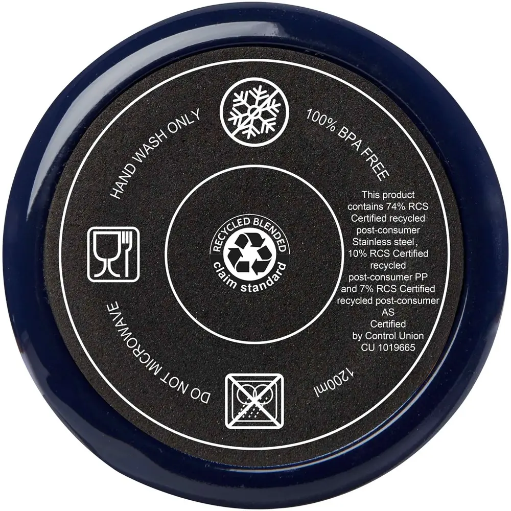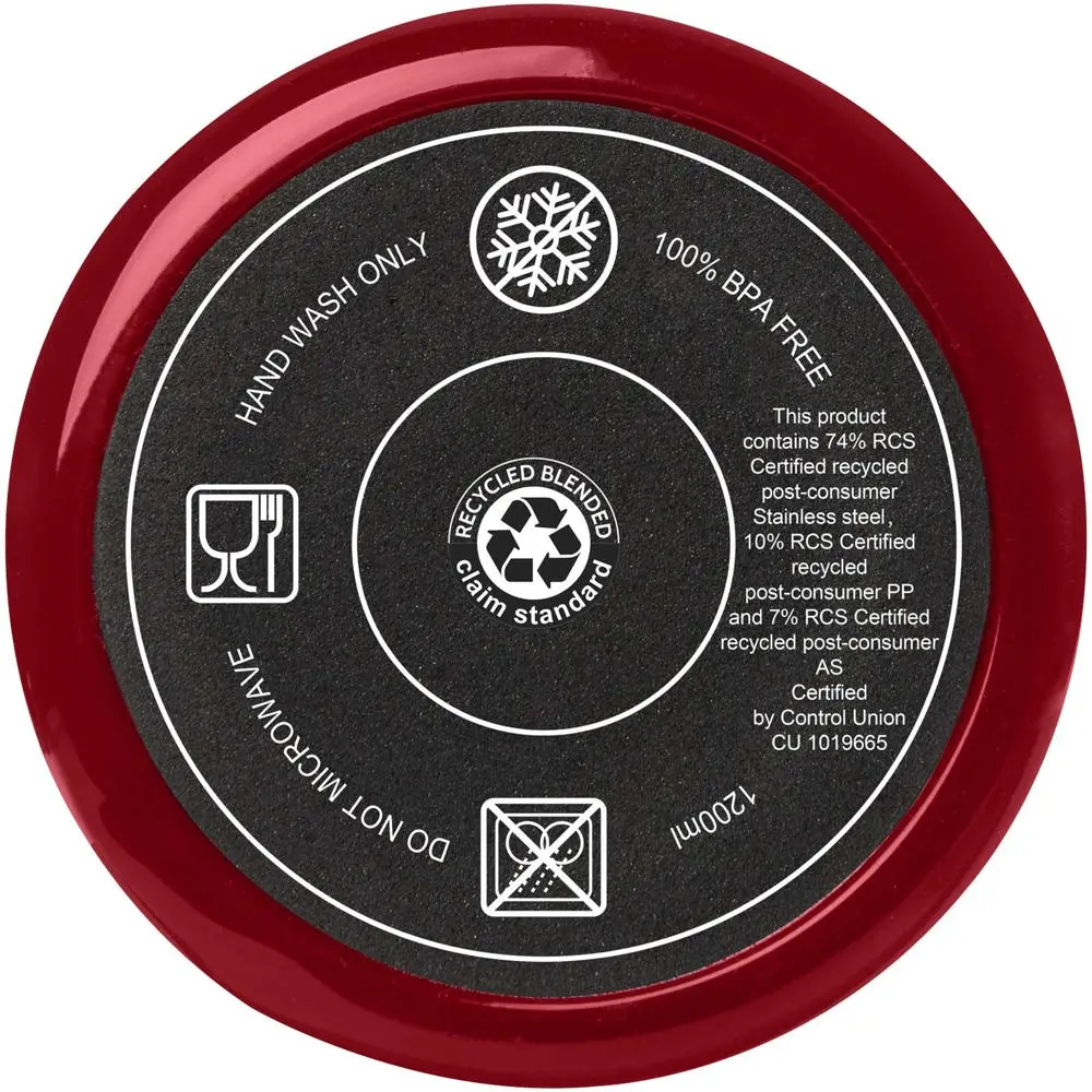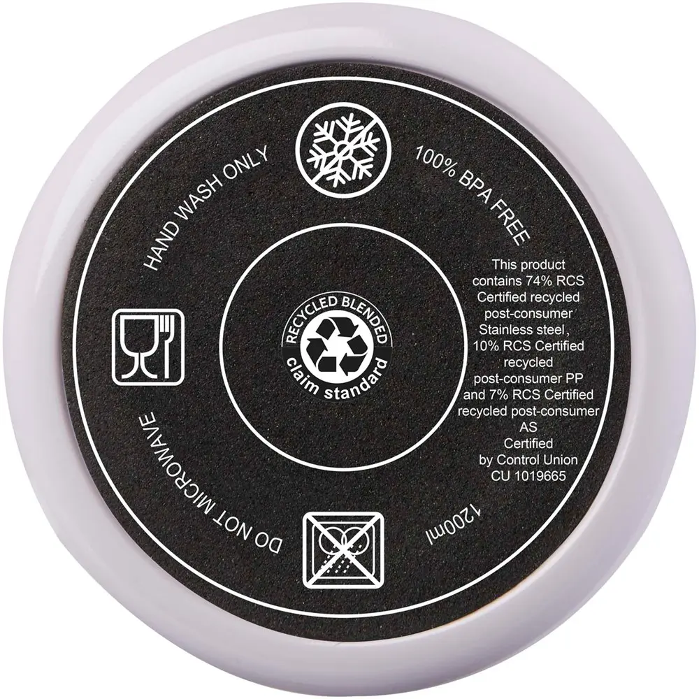 De binnenwand bestaat uit gerecycled kunststof en de buitenwand uit RCS-gecertificeerd gerecycled roestvrij staal. Deze keuze ondersteunt uw duurzame bedrijfsvisie en toont uw engagement voor het milieu. Kies voor deze beker als eco-vriendelijk relatiegeschenk dat uw merk versterkt.