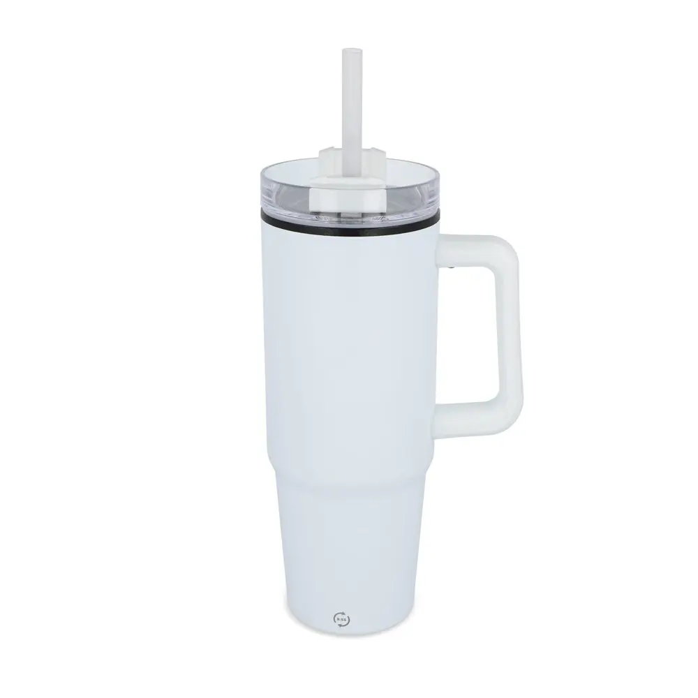 Deze beker houdt uw drankjes urenlang warm of koud, ideaal voor een actieve dag. Met een smalle bodem past hij naadloos in de meeste auto-bekerhouders, wat hem praktisch maakt voor onderweg. Het handvat zorgt voor een stevige grip, en het meegeleverde rietje bevordert eenvoudig hydrateren gedurende de hele dag. Dankzij het gebruik van gerecycled plastic draagt u bij aan een duurzamere wereld, terwijl de SMETA-naleving ethische productie garandeert. Uitdelen aan uw klanten tijdens events of als reclamegeschenk verhoogt uw merkzichtbaarheid en bouwt langdurige relaties op.