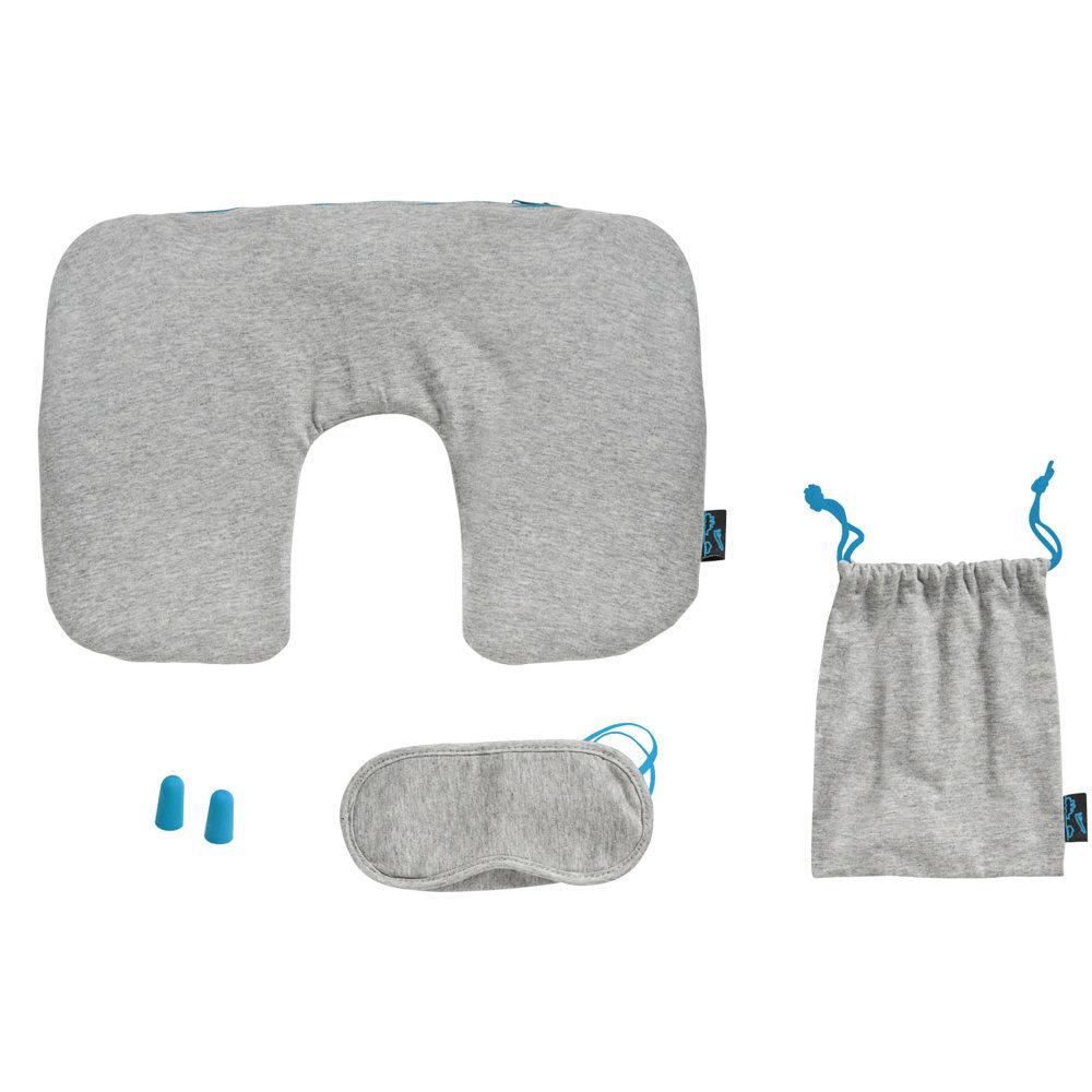 Je ontvangt een complete set met opblaasbaar nekkussentje met rits voor snelle opblaasing, zacht oogmasker met elastiek voor totale duisternis en zachte oordopjes voor rustige vluchten. Alles netjes verpakt in een handig tasje met trekkoord, perfect om mee te nemen.