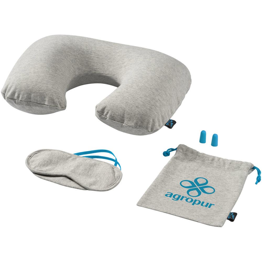 Met deze complete reisset ben je optimaal voorbereid op elke reis. Het opblaasbare nekkussen met rits geeft je nek stevige steun en is makkelijk mee te nemen. Het oogmasker met elastiek blokkeert al het licht voor een diepe slaap, en de zachte oordopjes zorgen voor stilte onderweg. Alles zit compact in een tasje met trekkoord, perfect om uit te delen aan je klanten of relaties.