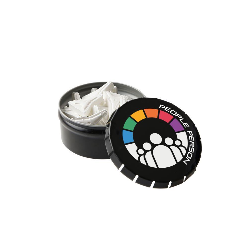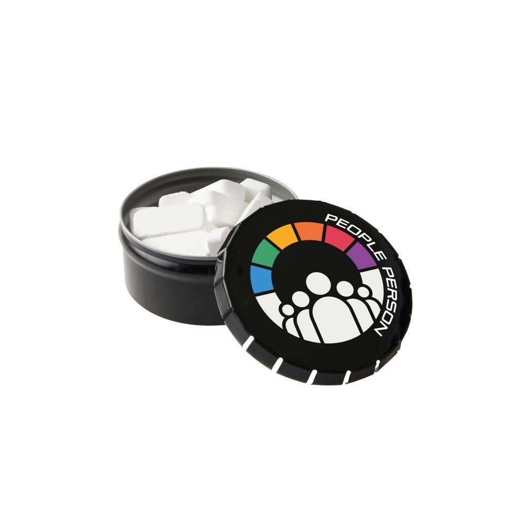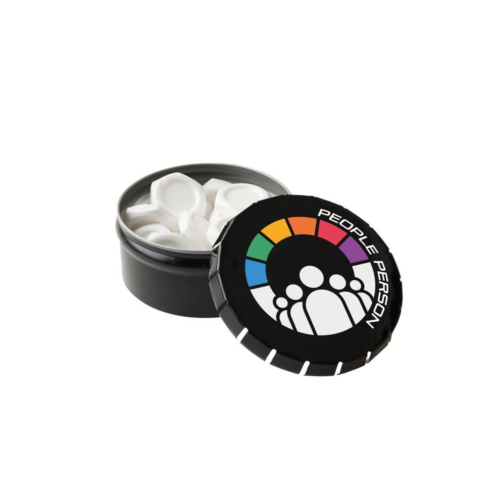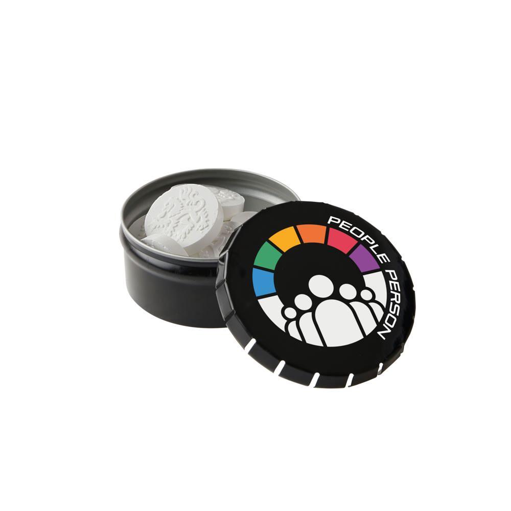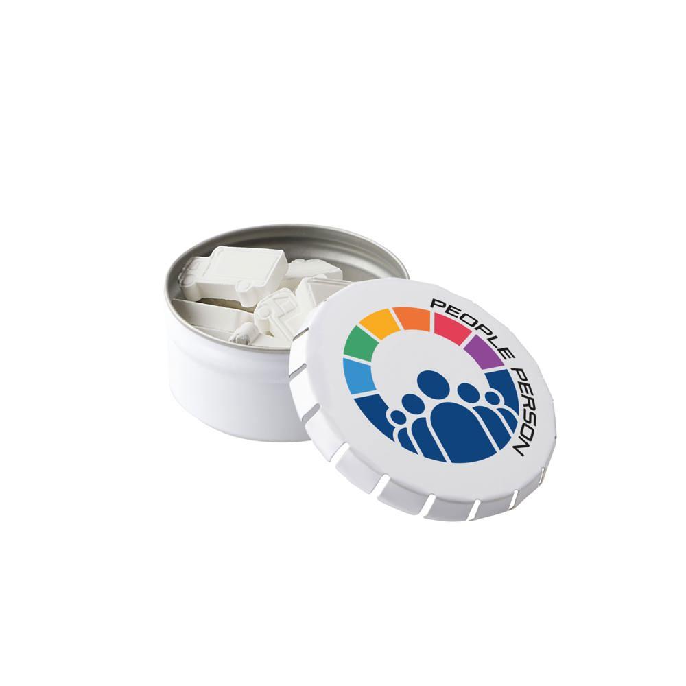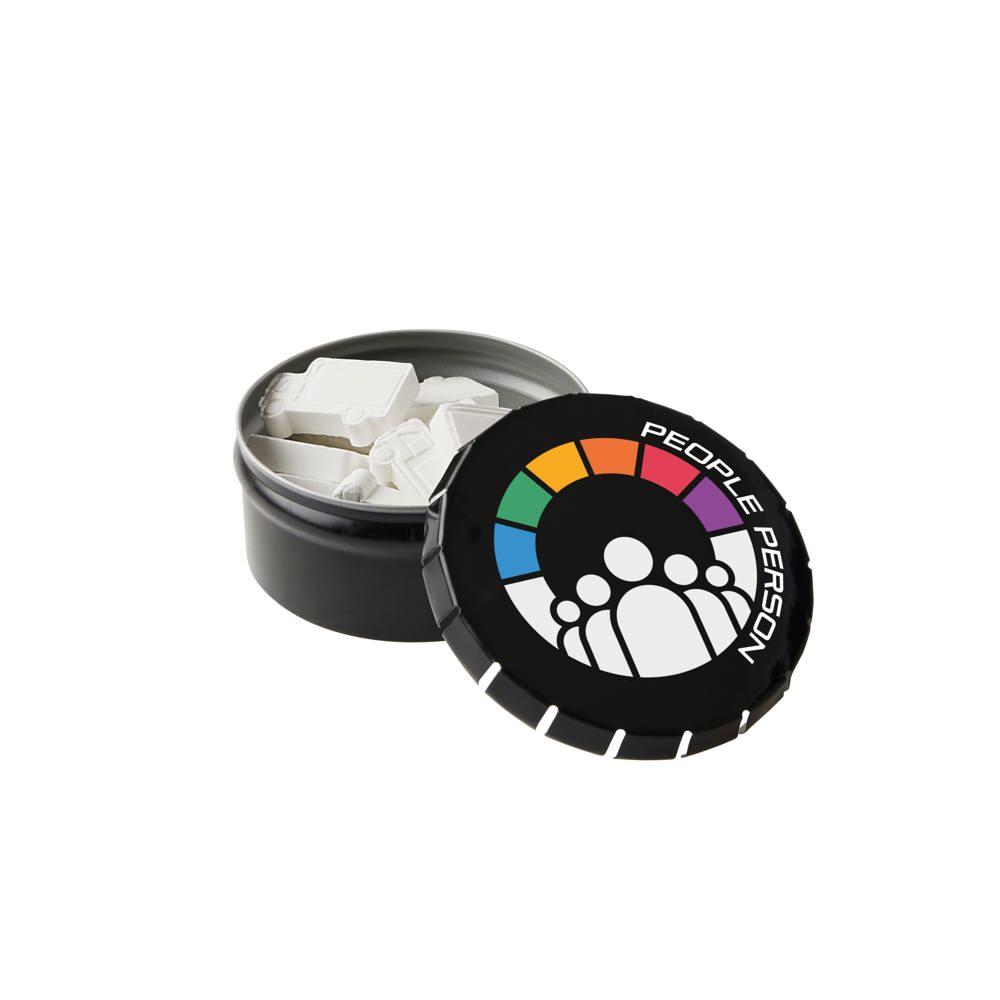 Je promoot je merk moeiteloos met ons mini clic-clac blikje met pepermunt. Dit compacte blikje (diameter 57 mm) zit vol met ca. 23 gram verfrissende Compli'mints en sluit met een handige clic-clac klik voor optimaal behoud van de smaak.