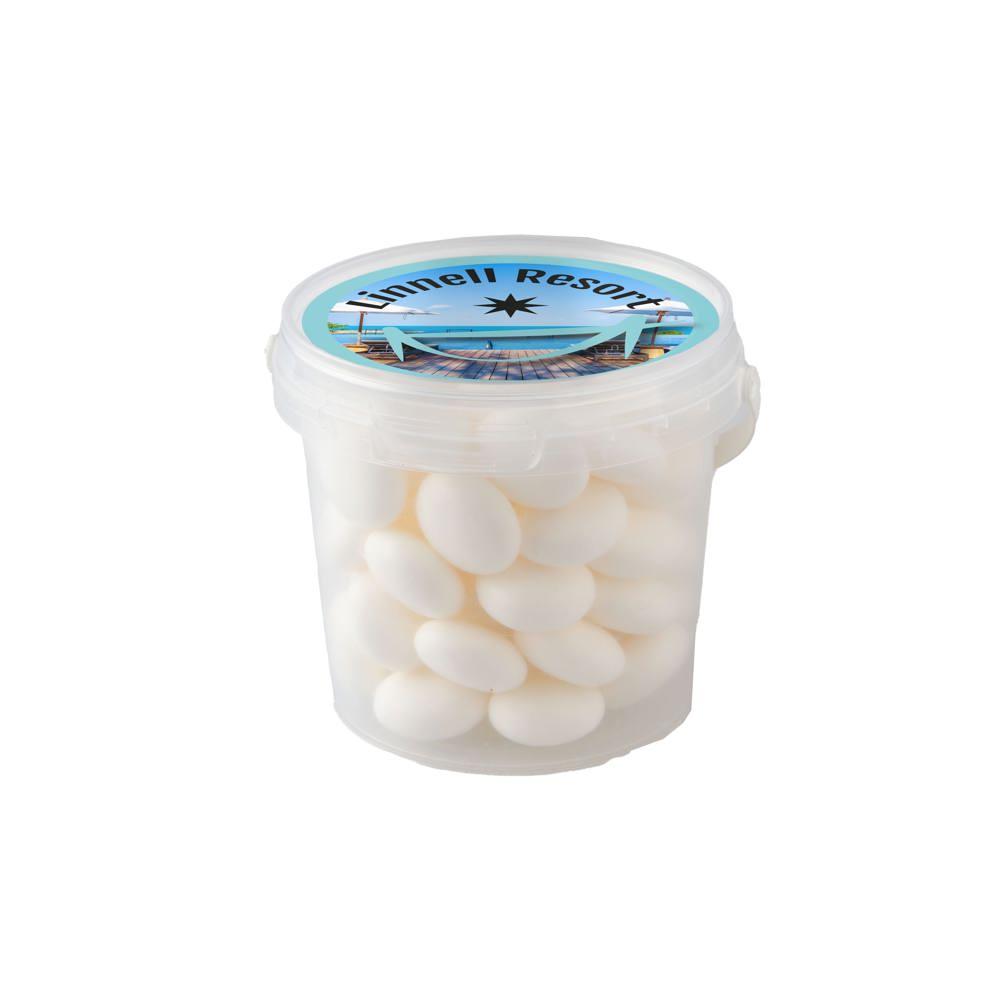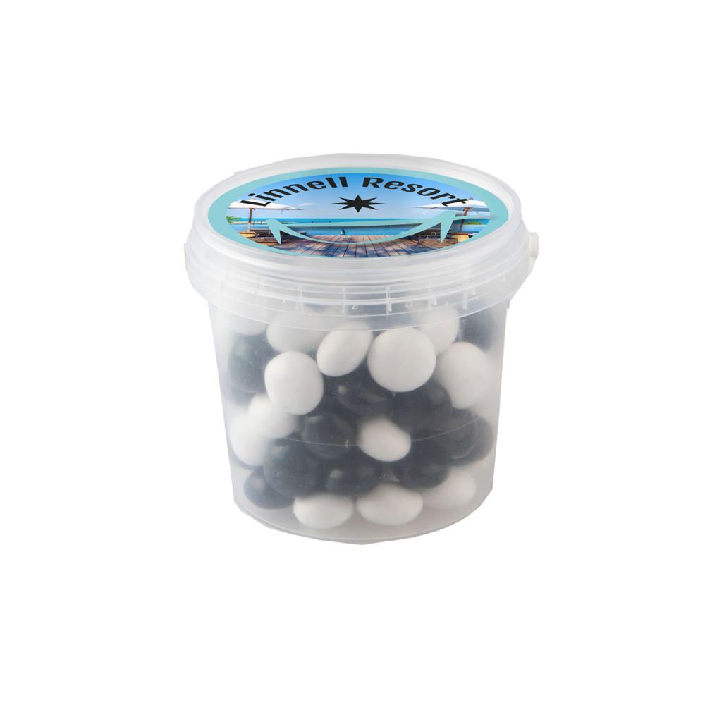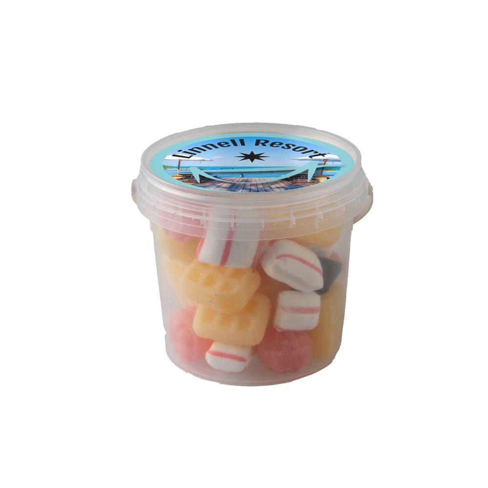 Je ontvangt een handig mini emmertje met een diameter van 70 mm, gevuld met ongeveer 160 gram lekkere dropstaafjes mix. Op het deksel plak je een full colour sticker met jouw logo of boodschap, perfect voor personalisatie.