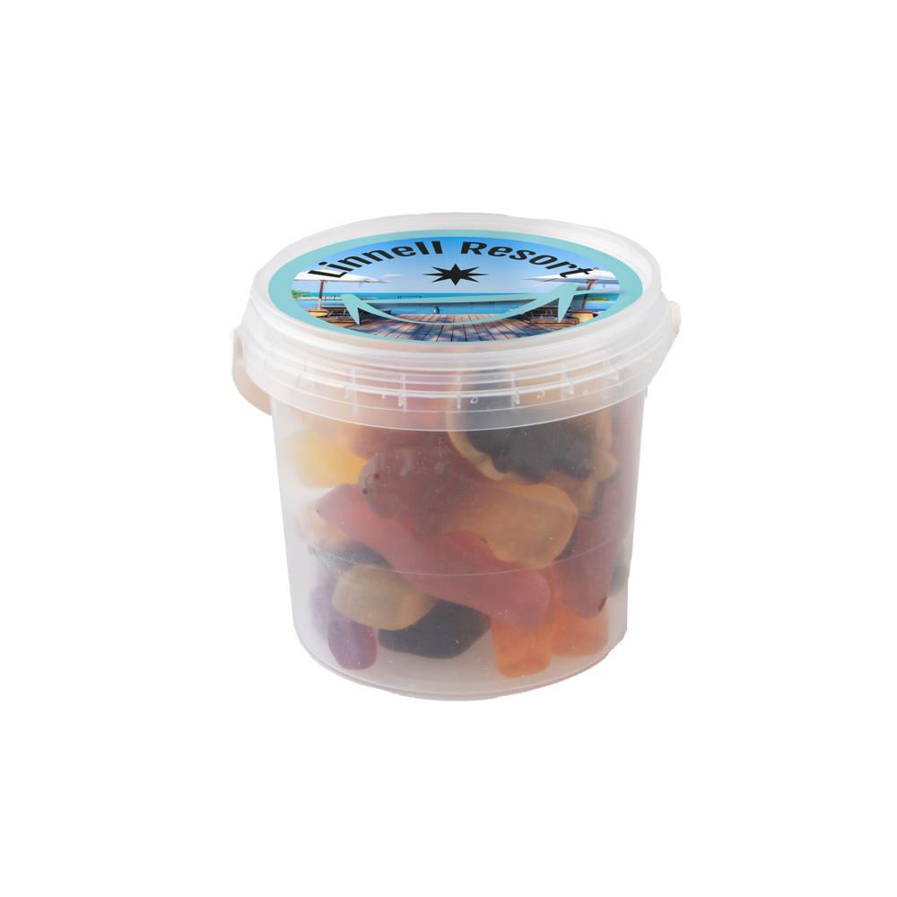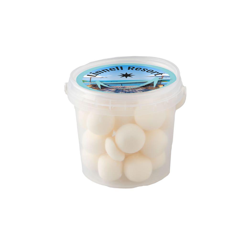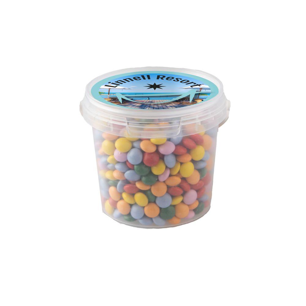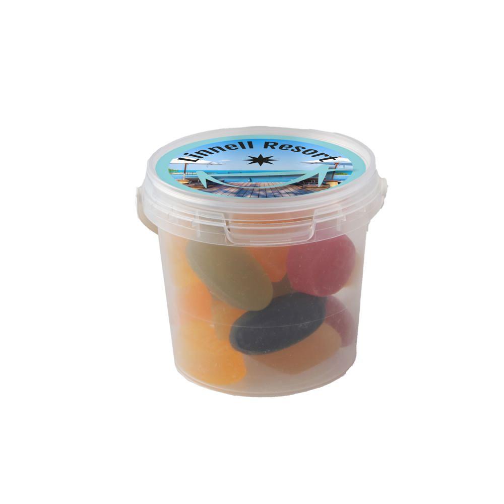 Je ontvangt een handig mini emmertje met een diameter van 70 mm, gevuld met ongeveer 160 gram lekkere dropstaafjes mix. Op het deksel plak je een full colour sticker met jouw logo of boodschap, perfect voor personalisatie.