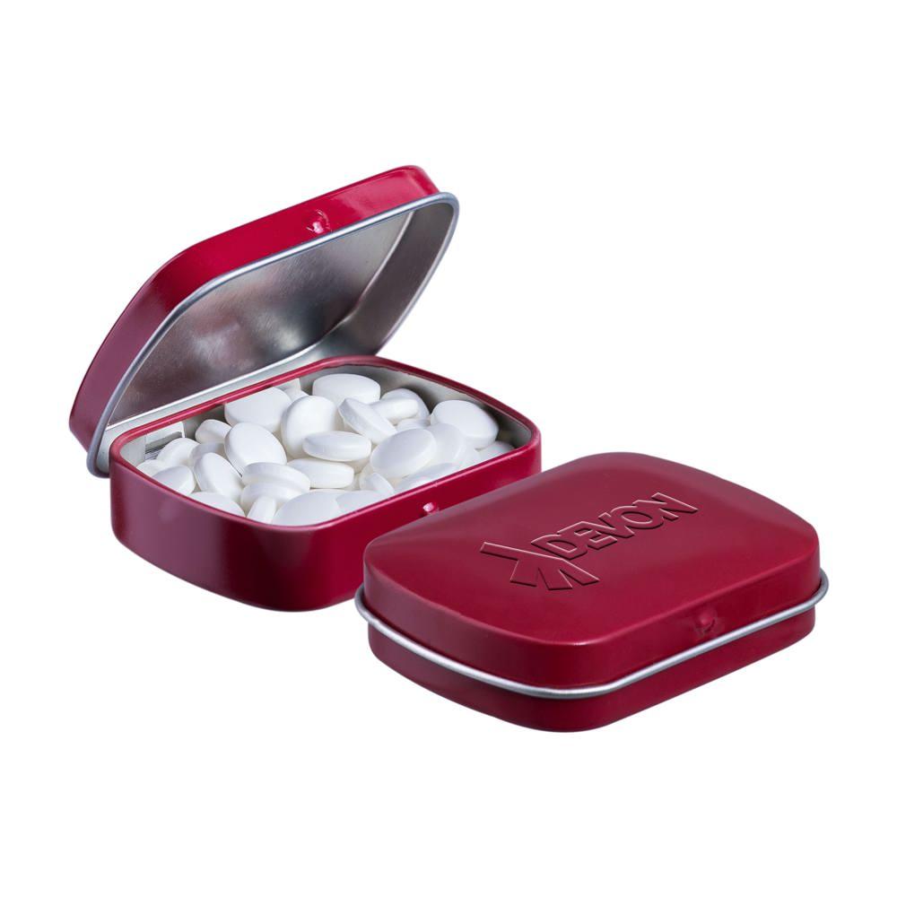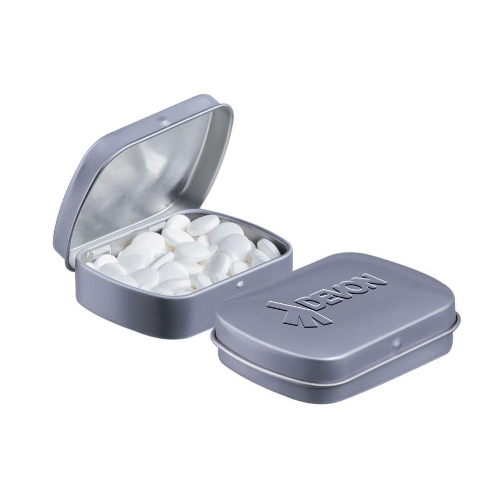 Ontdek dit compacte mini scharnierblikje, gevuld met circa 23 gram verfrissende pepermunt. Dankzij de embossing is het perfect voor jouw logo of bedrijfsdesign, ideaal als gepersonaliseerd relatiegeschenk.