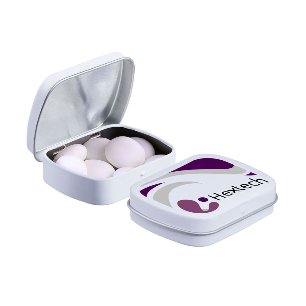 Dit compacte scharnierblikje biedt uw merk een effectieve manier om indruk te maken op klanten en relaties. Met ongeveer 28 gram verfrissende mentos mints erin, serveert u een praktisch en smakelijk geschenk dat langdurig wordt herinnerd. De full colour bedrukking zorgt voor een opvallende zichtbaarheid van uw logo, ideaal voor events en promotiecampagnes.