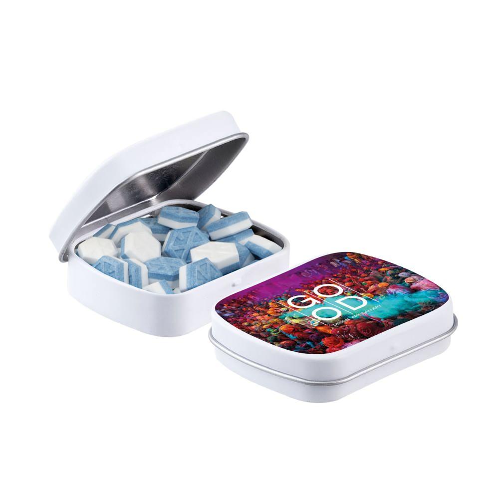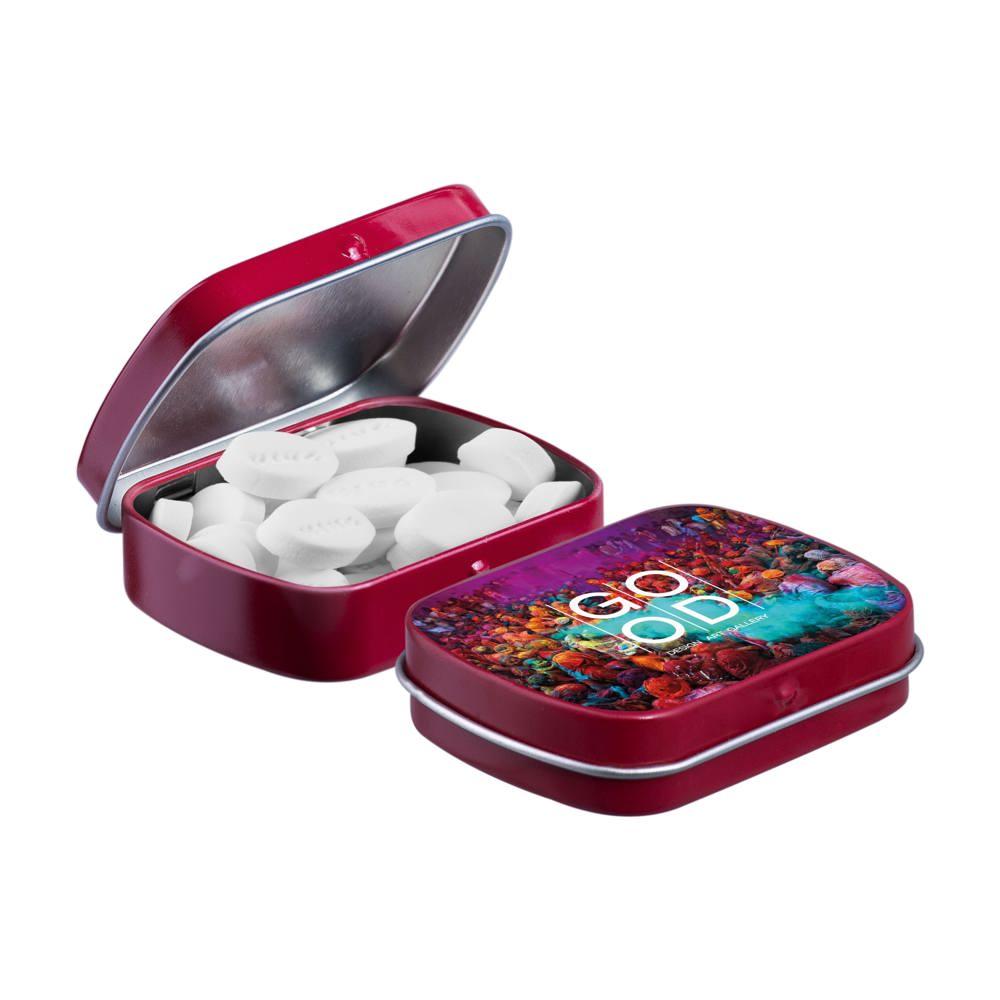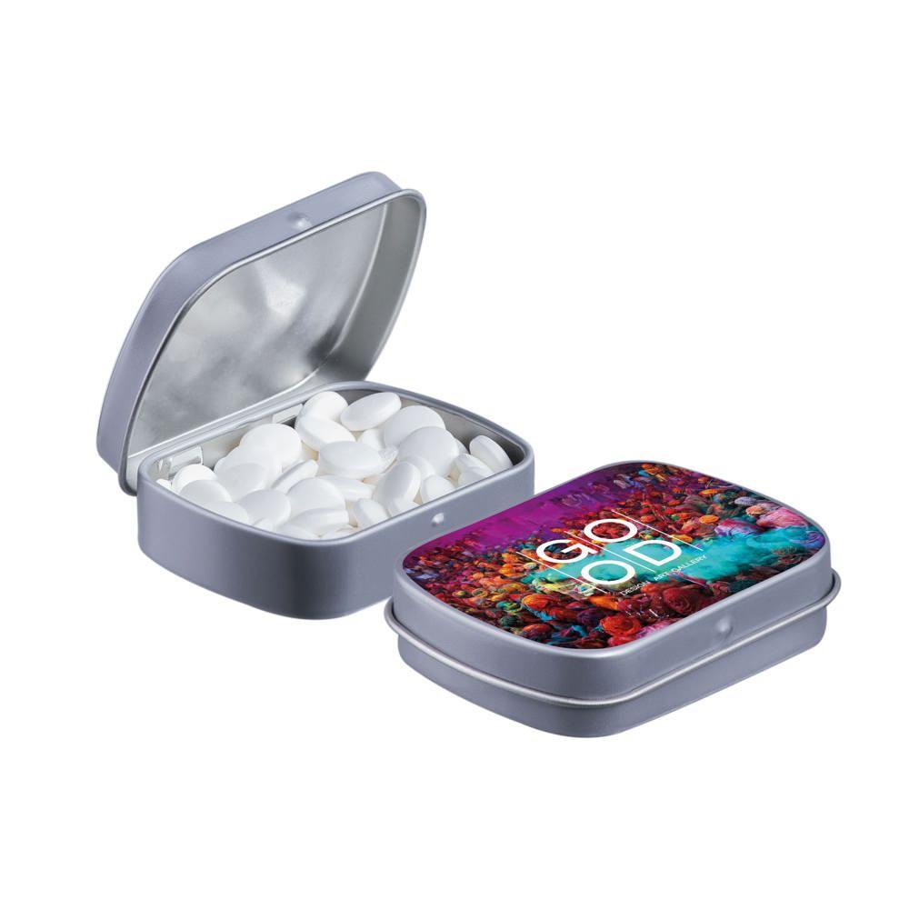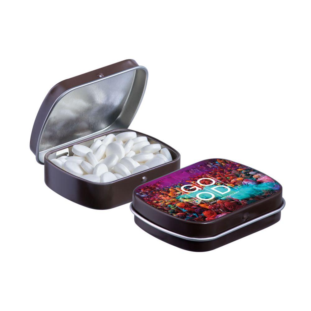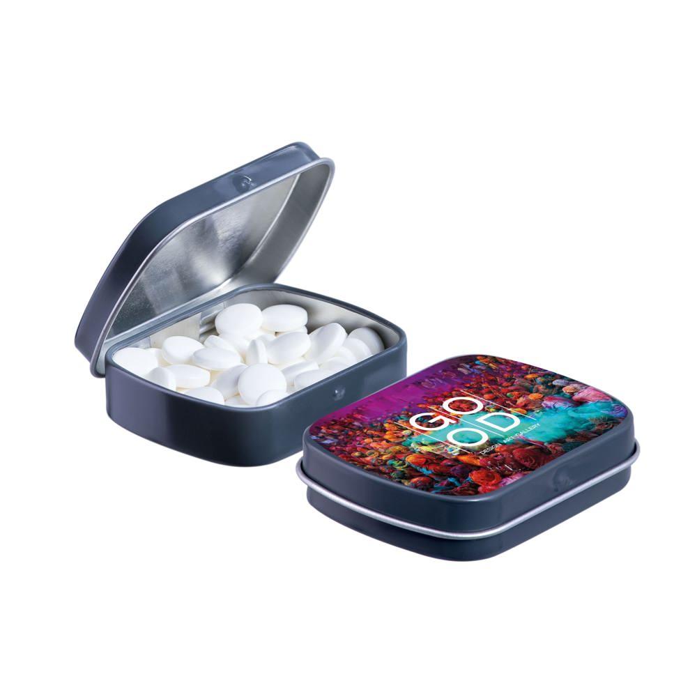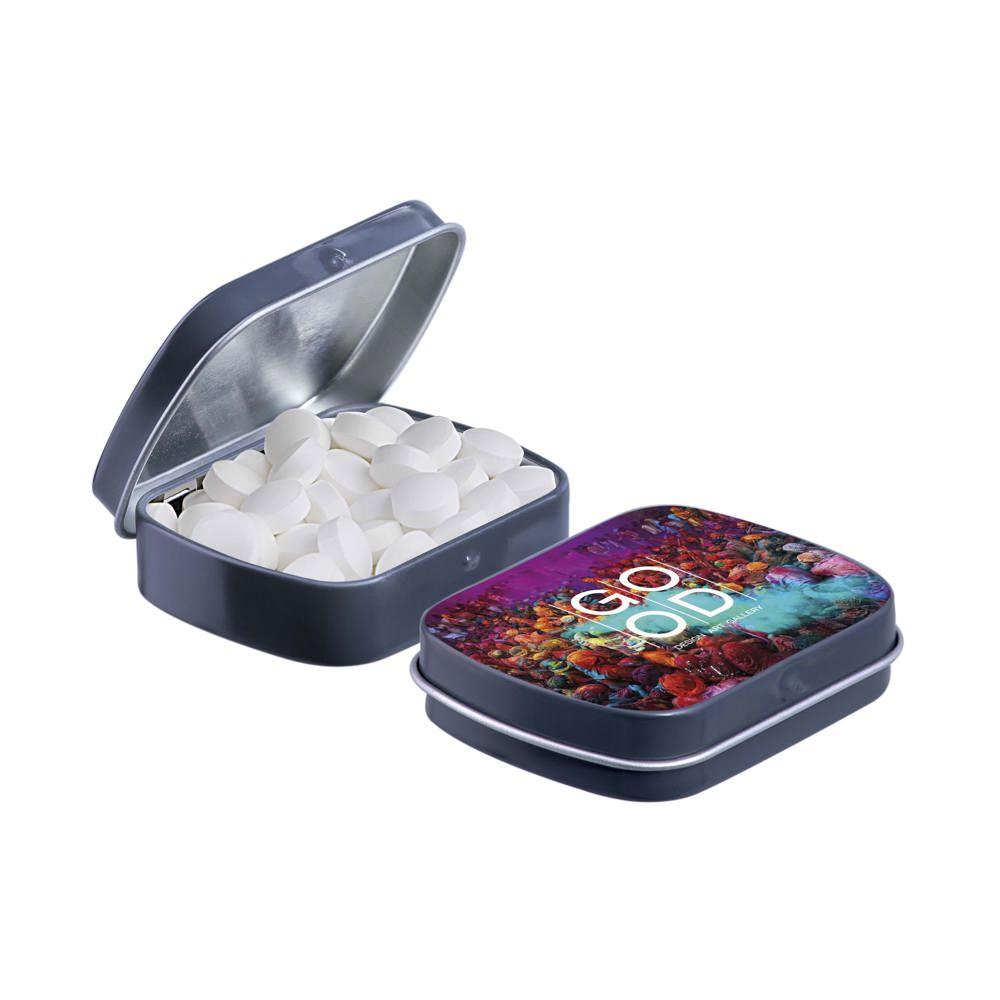 Je promoot je merk op een smakelijke manier met dit compacte mini scharnierblikje, gevuld met circa 23 gram suikervrije pepermunt. Personaliseer het met een full colour bedrukking van je logo voor maximale zichtbaarheid bij events of als relatiegeschenk.