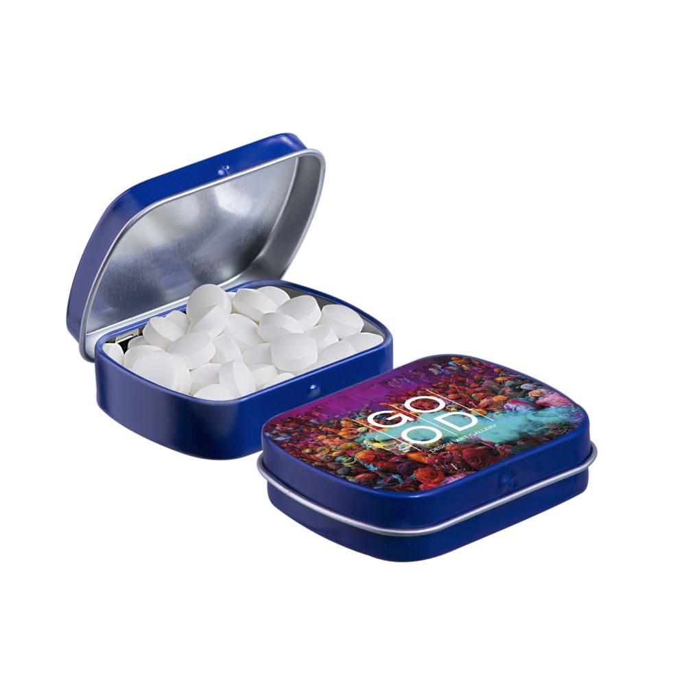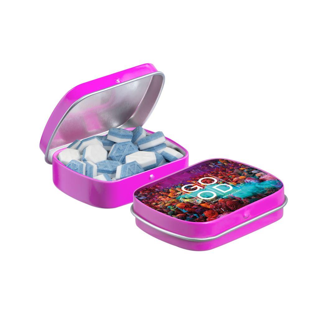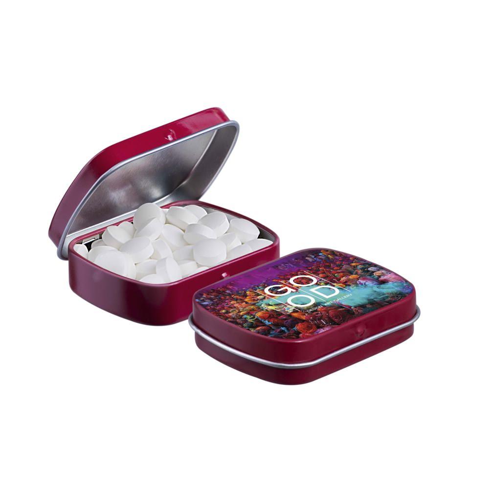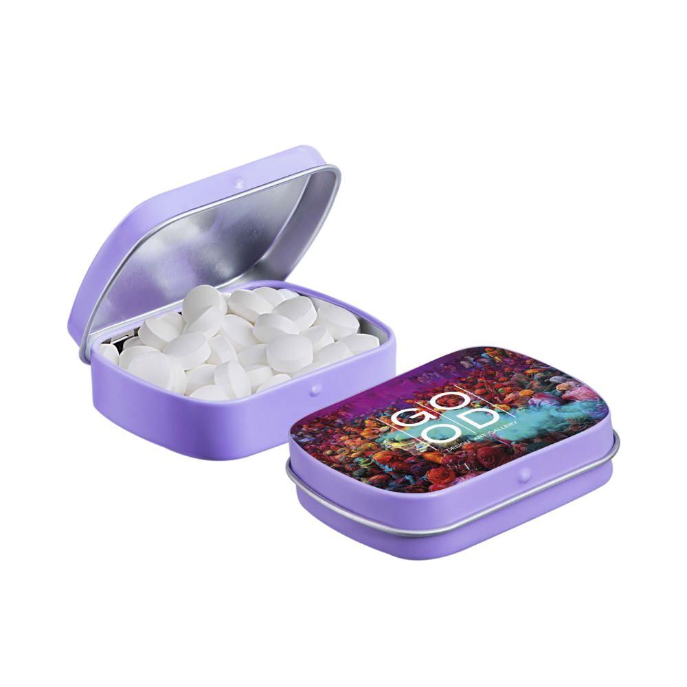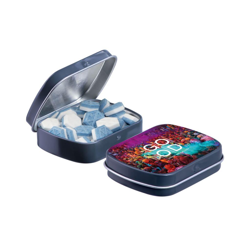 Je promoot je merk op een smakelijke manier met dit compacte mini scharnierblikje, gevuld met circa 23 gram suikervrije pepermunt. Personaliseer het met een full colour bedrukking van je logo voor maximale zichtbaarheid bij events of als relatiegeschenk.