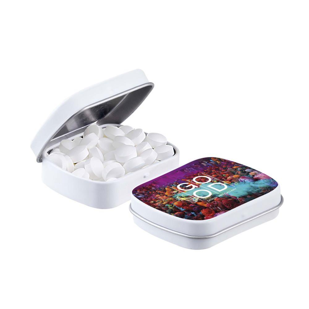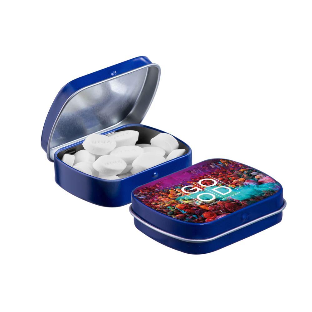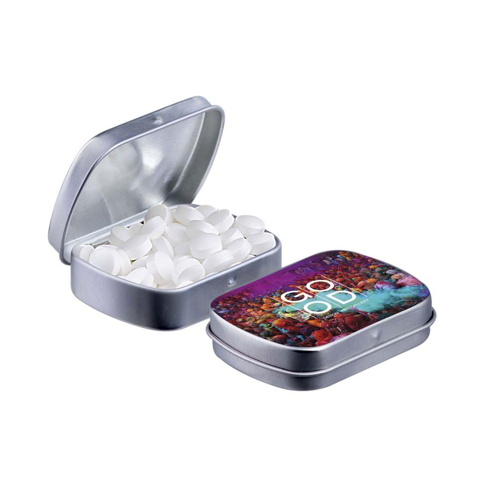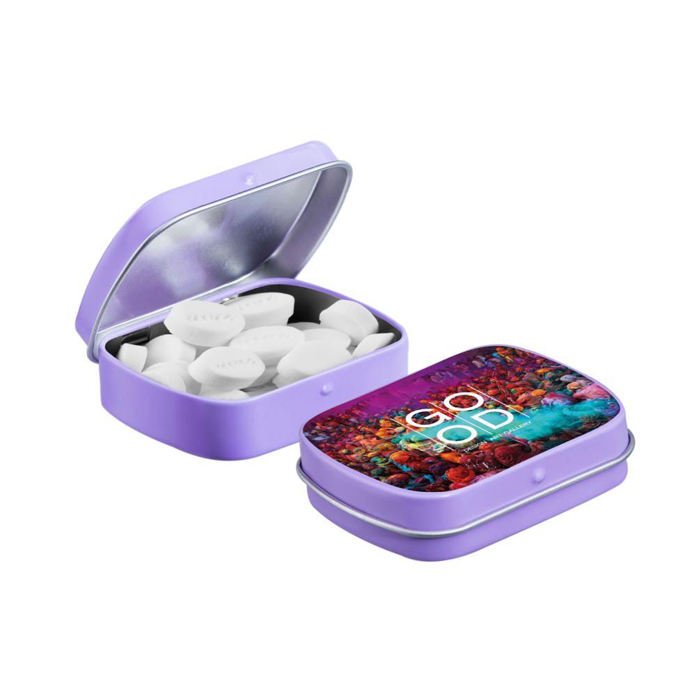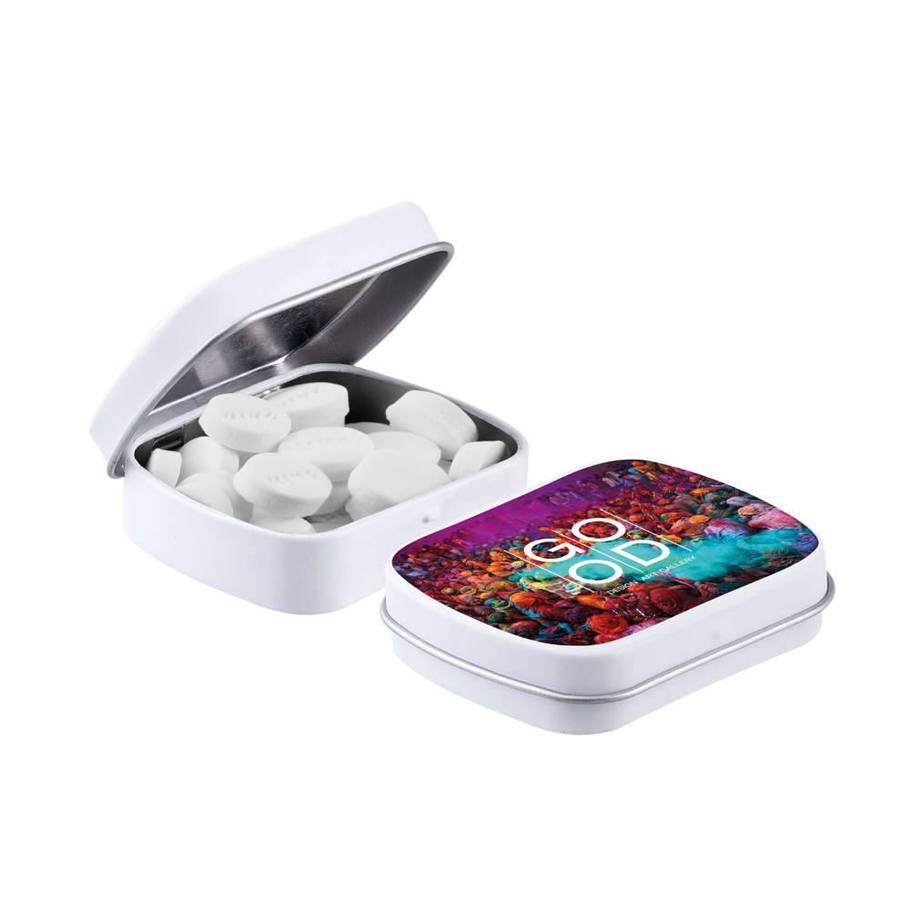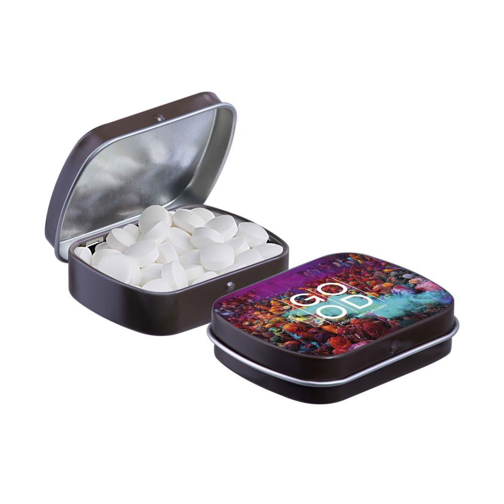 Je promoot je merk op een smakelijke manier met dit compacte mini scharnierblikje, gevuld met circa 23 gram suikervrije pepermunt. Personaliseer het met een full colour bedrukking van je logo voor maximale zichtbaarheid bij events of als relatiegeschenk.