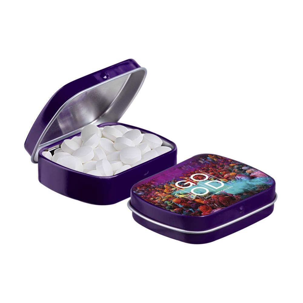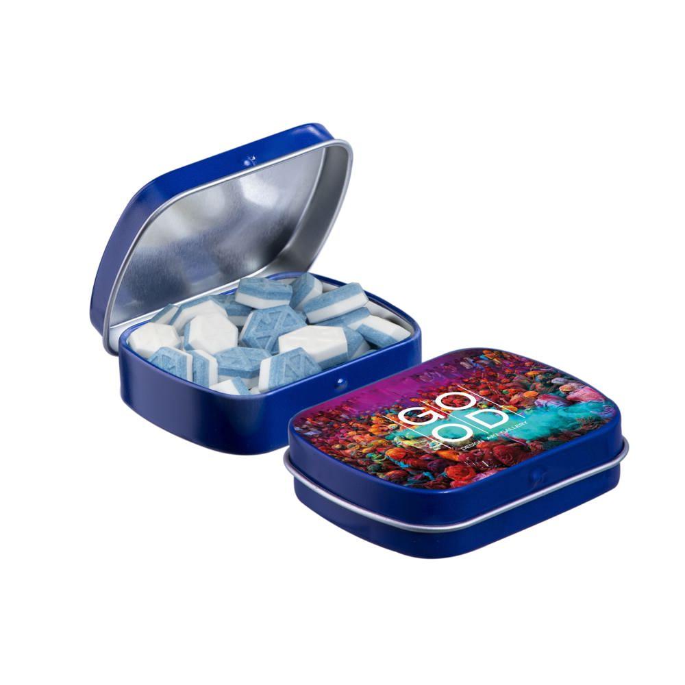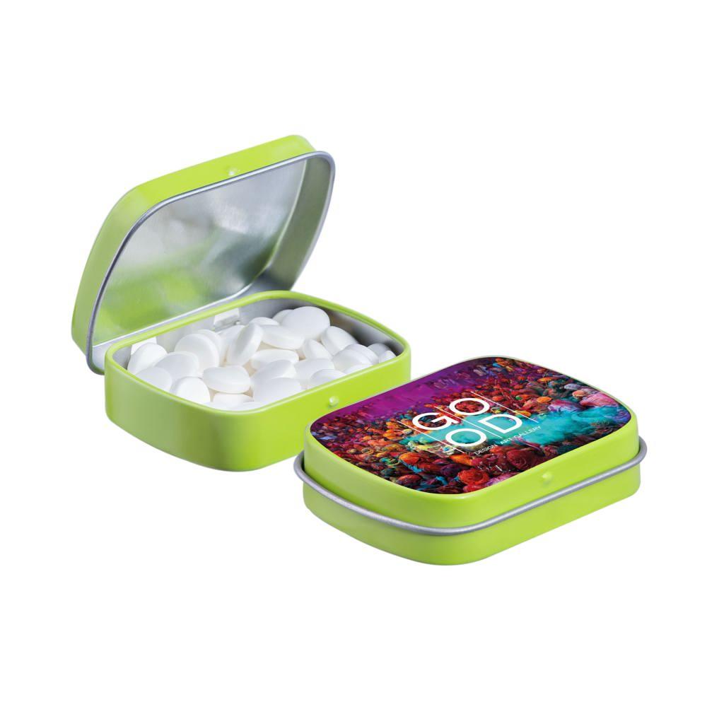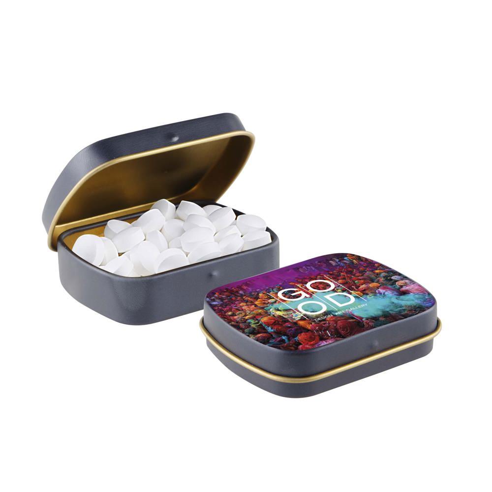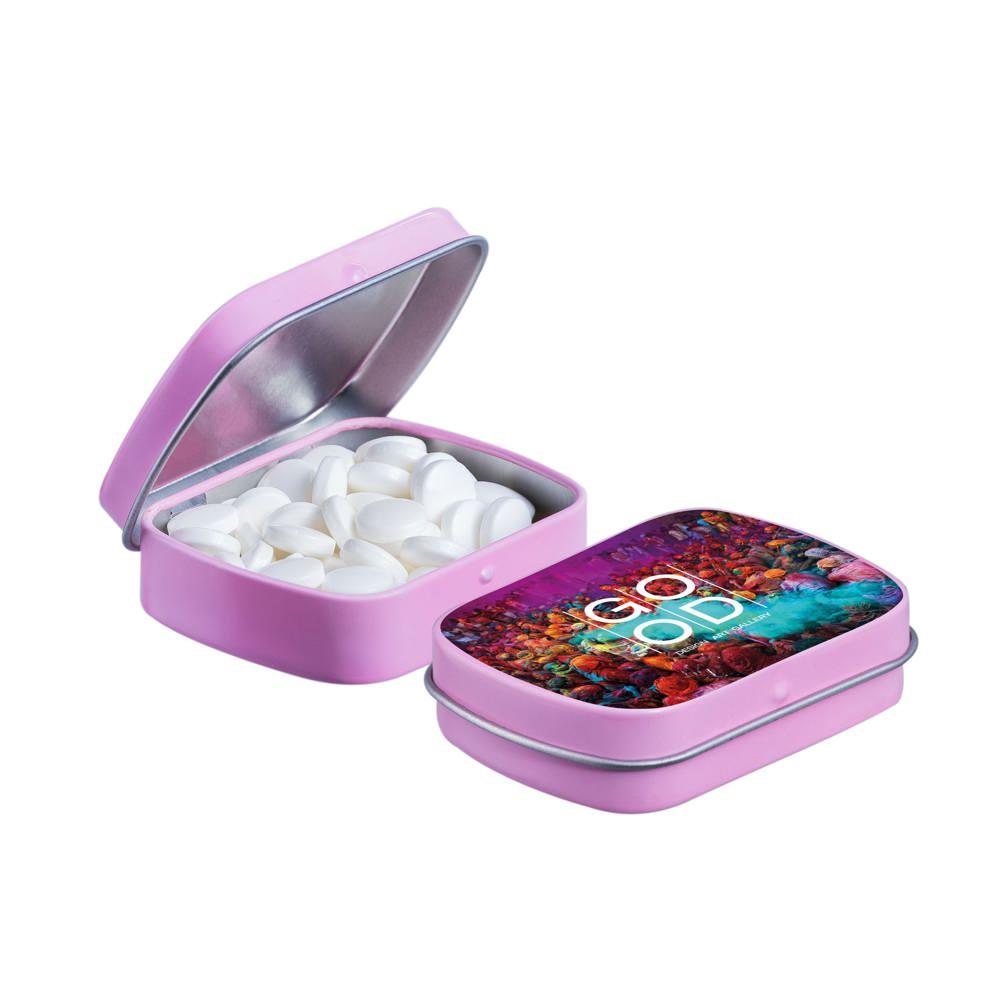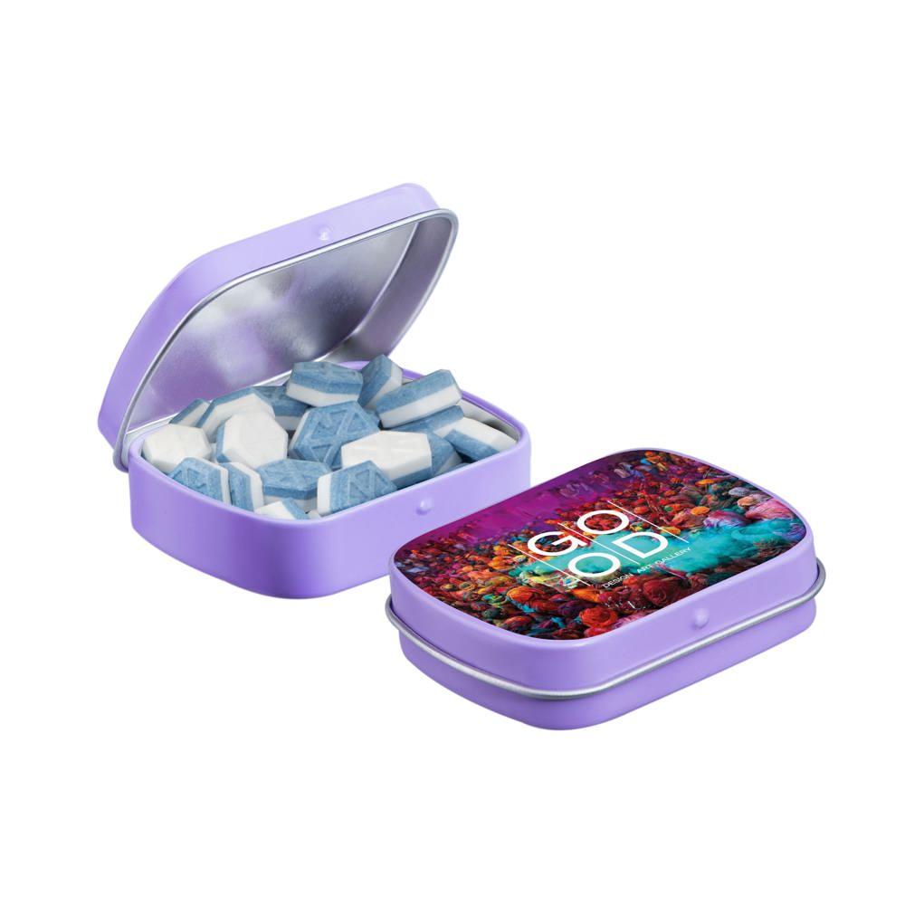 Je promoot je merk op een smakelijke manier met dit compacte mini scharnierblikje, gevuld met circa 23 gram suikervrije pepermunt. Personaliseer het met een full colour bedrukking van je logo voor maximale zichtbaarheid bij events of als relatiegeschenk.