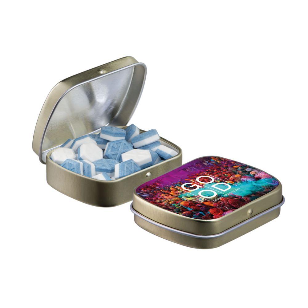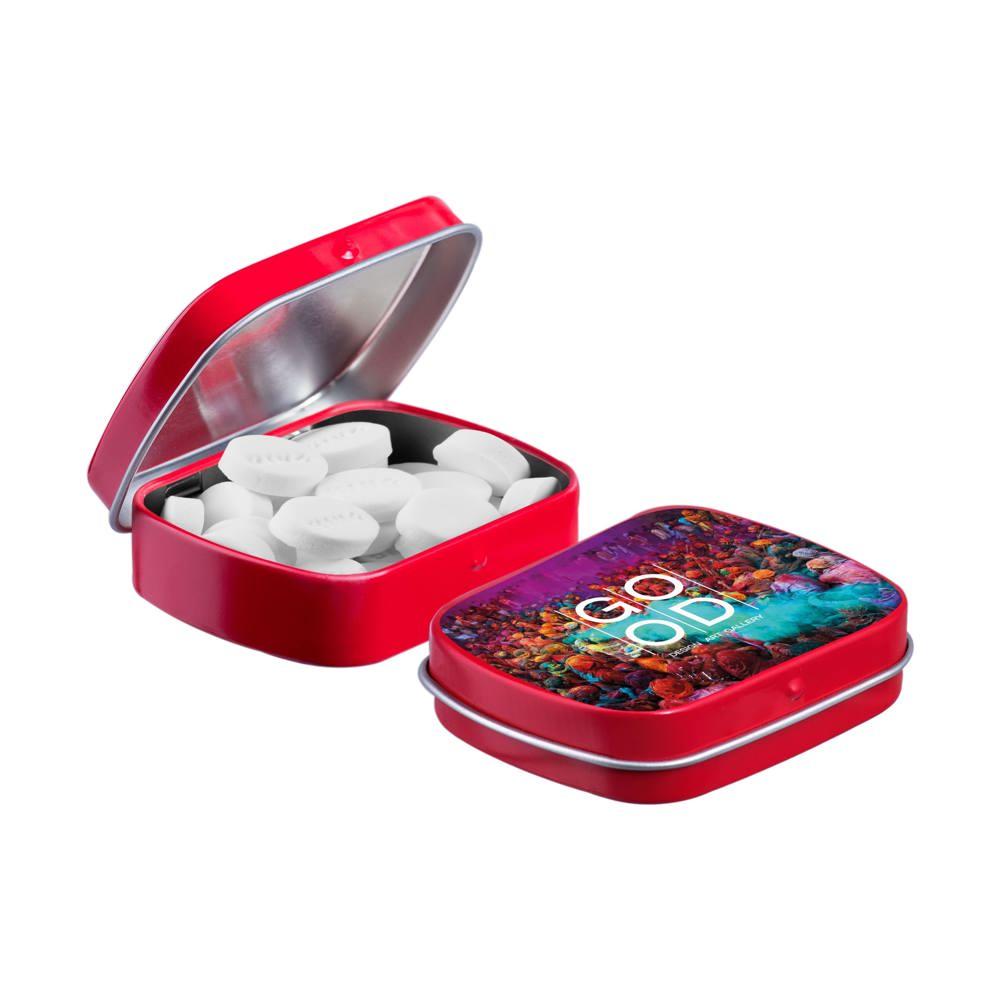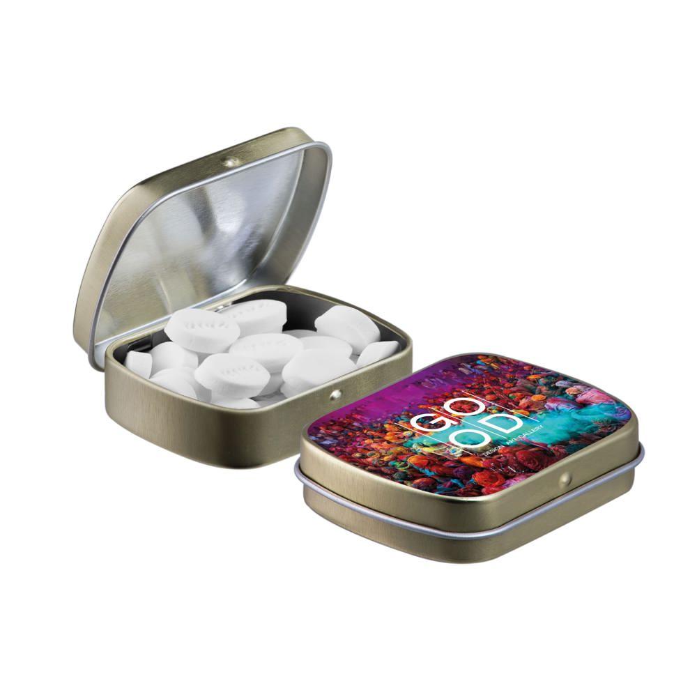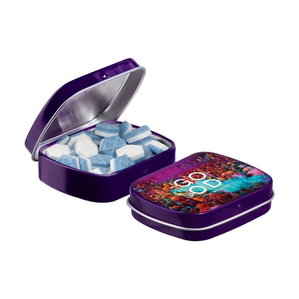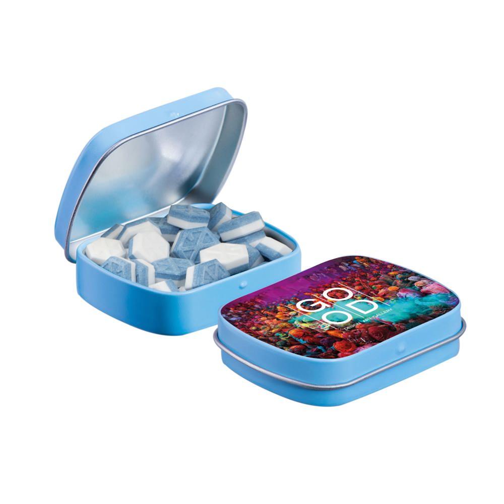 Je promoot je merk op een smakelijke manier met dit compacte mini scharnierblikje, gevuld met circa 23 gram suikervrije pepermunt. Personaliseer het met een full colour bedrukking van je logo voor maximale zichtbaarheid bij events of als relatiegeschenk.