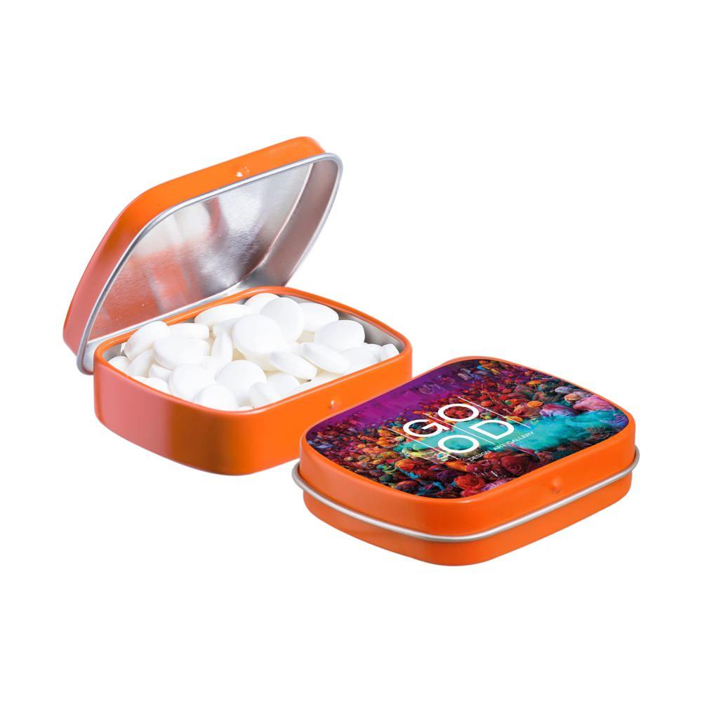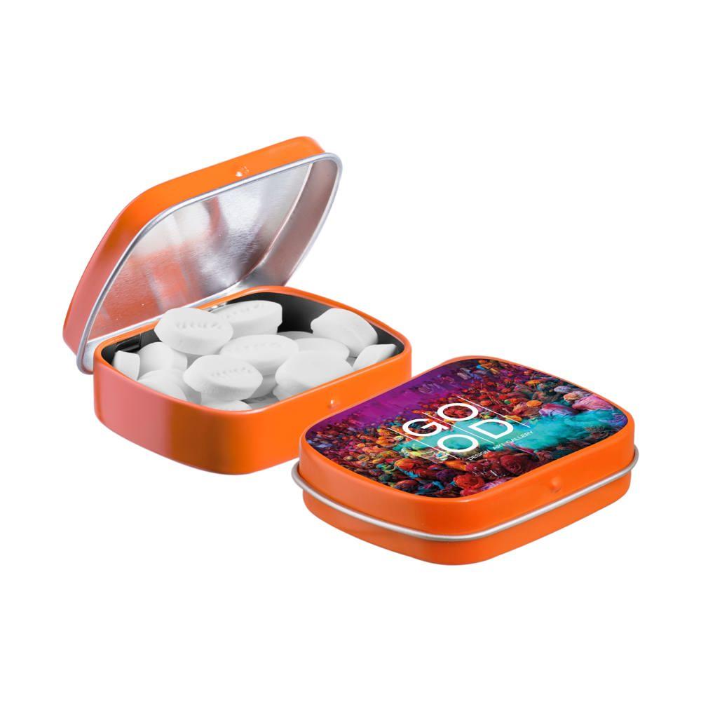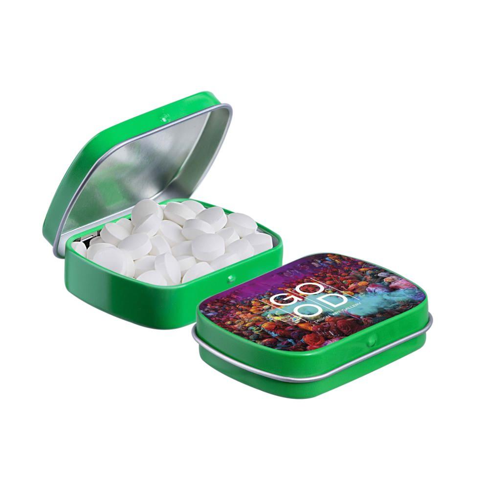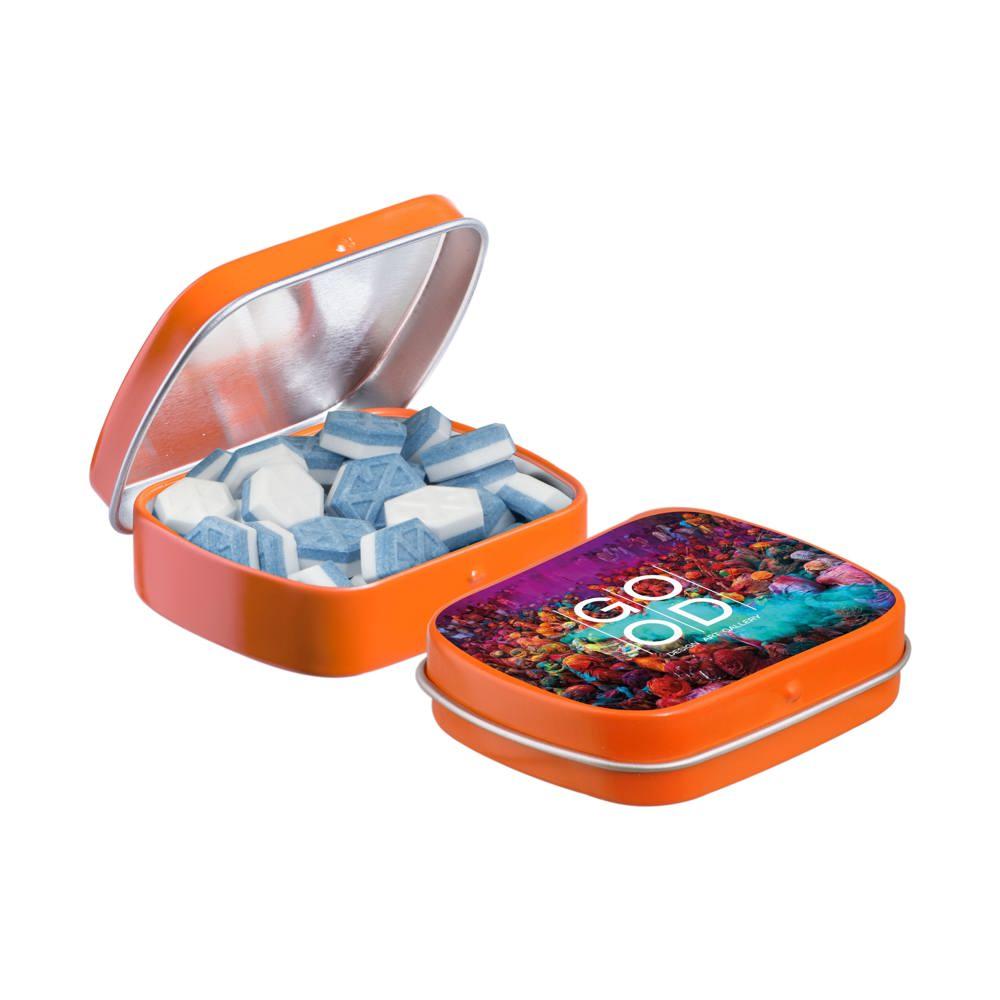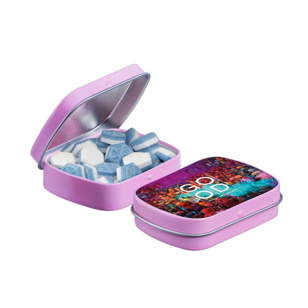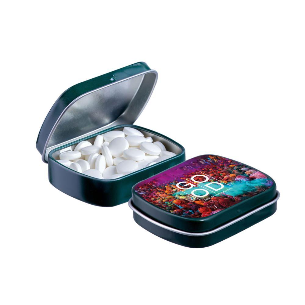 Je promoot je merk op een smakelijke manier met dit compacte mini scharnierblikje, gevuld met circa 23 gram suikervrije pepermunt. Personaliseer het met een full colour bedrukking van je logo voor maximale zichtbaarheid bij events of als relatiegeschenk.