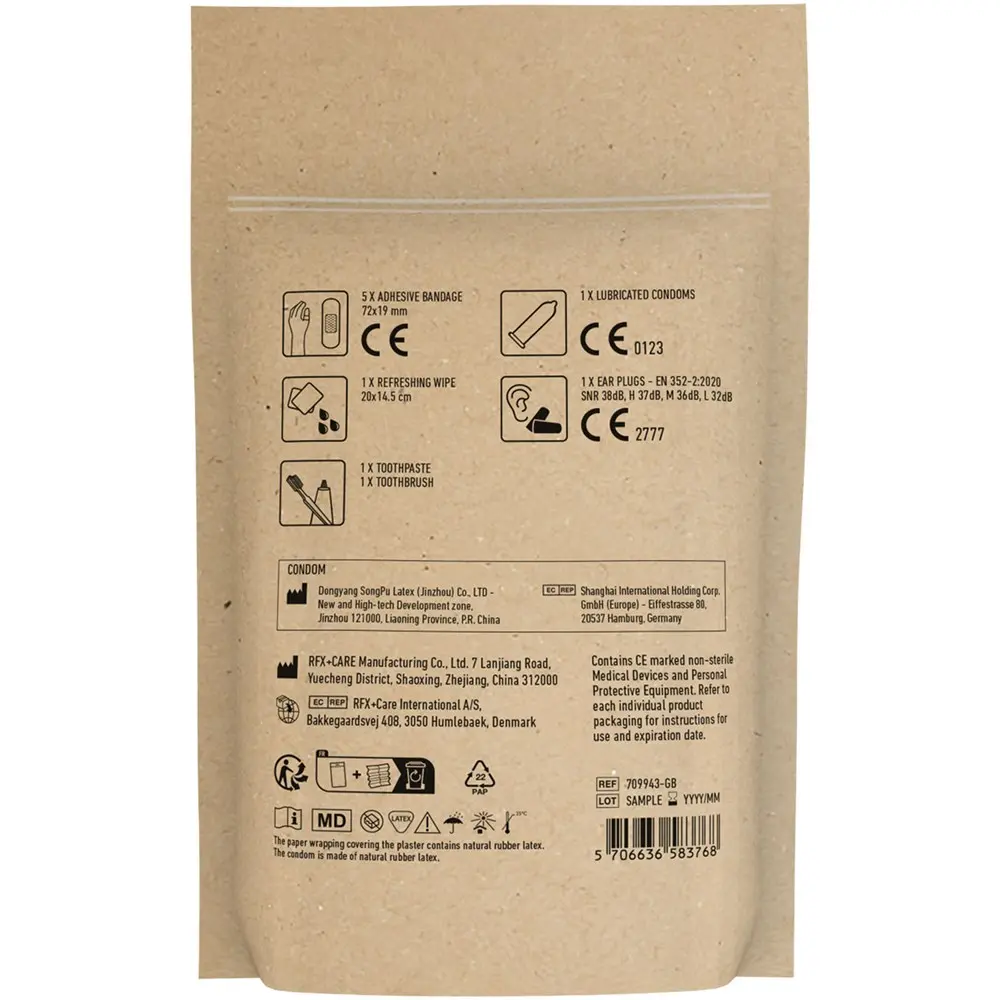 De set bevat essentiële items voor eerste hulp en verzorging: een tandenborstel, tandenpasta, oordopjes, desinfecterende gel, vijf waterbestendige pleisters en een condoom. Alle producten voldoen aan EU-regelgeving en zijn gemaakt van FSC-gecertificeerd papier, voor een duurzame indruk.