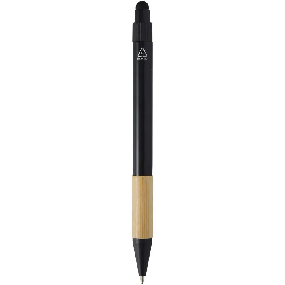 - Balpen: RCS-gecertificeerde pen van gerecycled aluminium met bamboe grip en styluspunt.