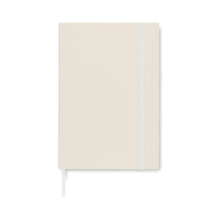 Ontdek ons A5 notitieboek met harde kaft, vervaardigd uit 70% gerecycled melkpak en 30% gerecycled papier. Dit milieuvriendelijke product biedt 160 gelinieerde pagina's (80 vel van 80 grams), ingebonden voor langdurig gebruik. Een elastische sluitingsband en een bladwijzer met lint zorgen voor optimaal comfort en organisatie.