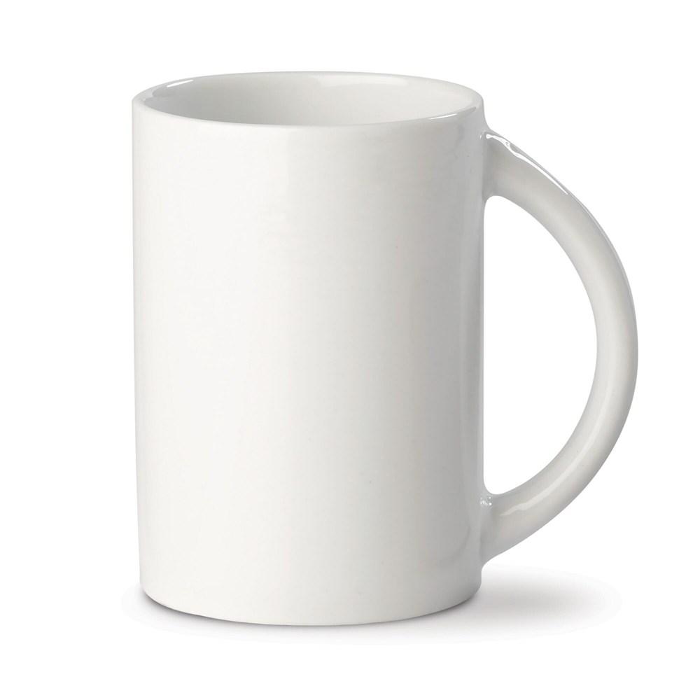 Porseleinen witte mok. Hoog en slank model met groot oor.