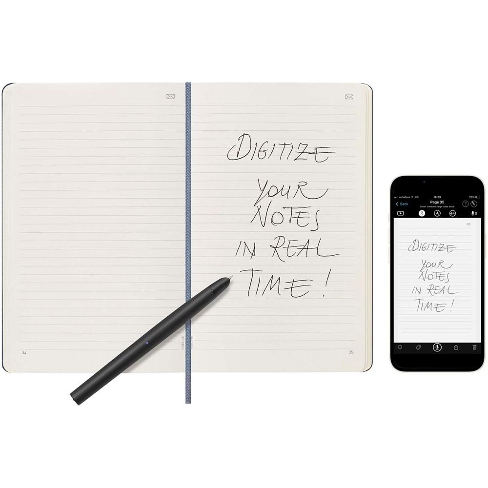 Het hart van Moleskine's Smart Writing Set assortiment is het Smart Notebook met zijn klassieke Moleskine vorm en ivoorkleurig papier. Elke pagina bevat onzichtbare Ncodes waarmee de Smart Pen direct een digitale kopie maakt van elk woord en elke schets binnen de Moleskine Notes App. Voorzien van een elastische sluiting, ivoorkleurig, zuurvrij 100 g/m² gelijnd, speciaal papier dat is ontworpen om met de Moleskine Smart Pen te werken, een “In geval van verlies” mededeling op het schutblad en een uitbreidbaar binnenvak aan de achterkant.