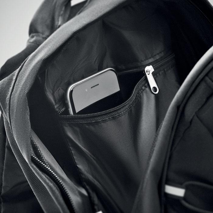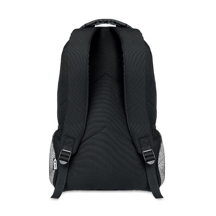 Rugzak van 600D RPET met donker koord voor op de rugzak en een reflecterend paneel voor betere zichtbaarheid in het donker. Mesh zakken aan beide zijden van de rugzak.