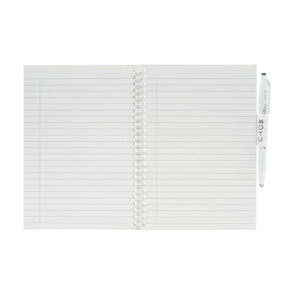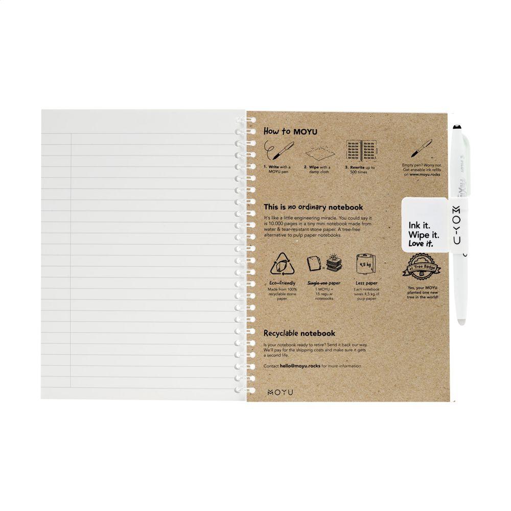 Uitwisbaar A5-notitieboek van steenpapier van het merk MOYU. De stevige cover is van 440 grams gerecycled kraftkarton. Inclusief pen en schoonmaakdoekje. Iedere steenpapieren pagina is van nature boomvrij en 100% recyclebaar. Dit notitieboek met elastische pennenlus, is gebonden in een sterke wire-o-binding en telt 18 pagina's gelinieerd papier. Maak je notities met de bijbehorende, speciale MOYU pen. De pen bevat de originele Frixion inkt. De inkt droogt volledig op steenpapier en is gemakkelijk uit te wissen zonder sporen achter te laten. Maak het meegeleverde MOYU doekje een beetje vochtig met wat water en wis de inkt uit. Zo blijven pagina's leeg voor nieuwe ideeën en to-do-lijstjes. Je kunt steenpapier zo'n 500 keer opnieuw beschrijven. Dit notitieboek gaat jarenlang mee. Steenpapier is gemaakt van 80% kalksteen en 20% schone kunststof. Het is van nature vrij van bomen, en er zijn geen water en chemicaliën nodig om het te maken. De productie van steenpapier is daarom zuiniger en er is 67% minder CO2-uitstoot dan de bij productie van pulp papier. Bovendien is steenpapier eindeloos te recyclen, zonder nieuwe grondstoffen toe te hoeven voegen.