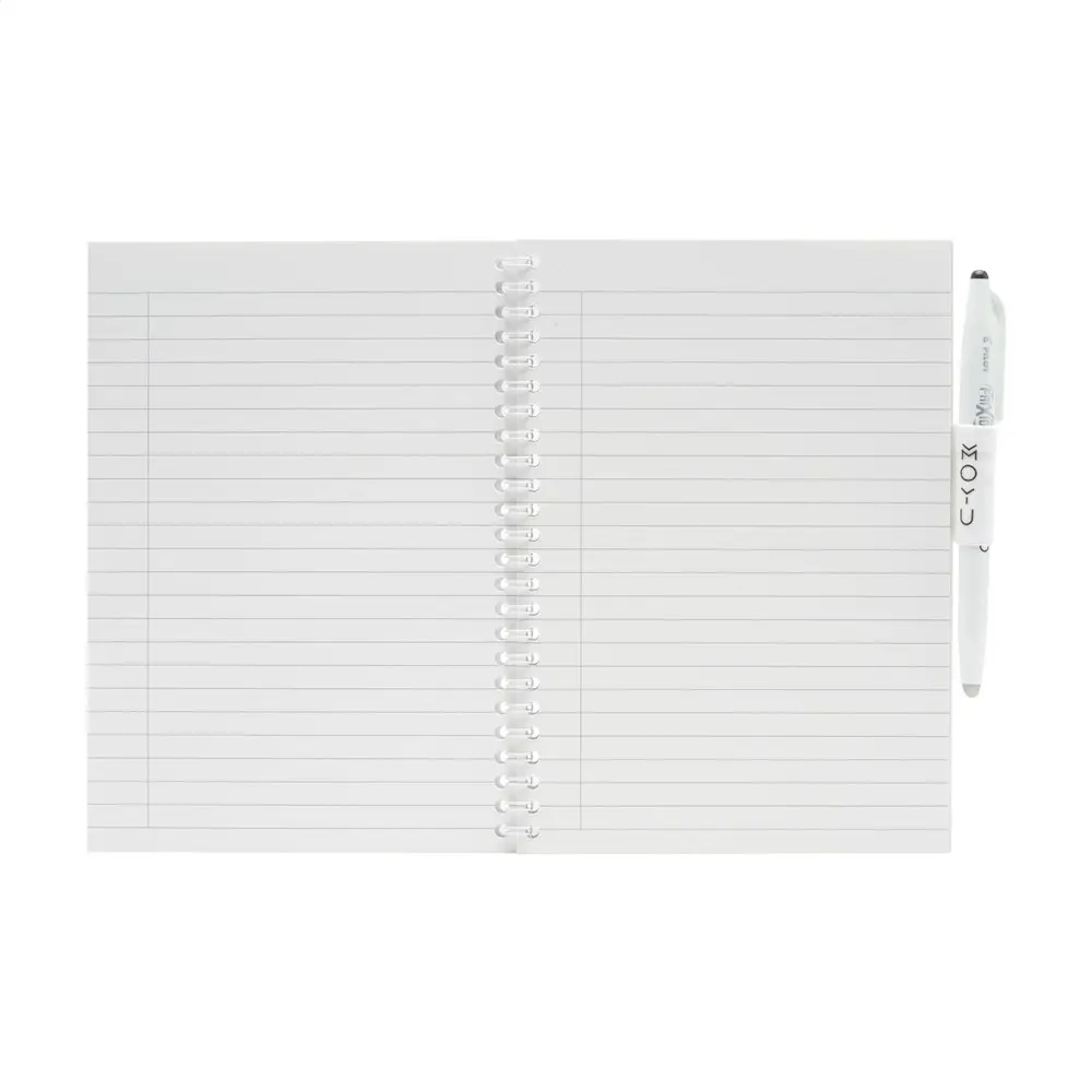 Elke van de 18 gelinieerde pagina's kunt u tot 500 keer herschrijven. De Frixion-inkt van de meegeleverde pen droogt volledig op en wist u eenvoudig met een vochtig doekje, zonder sporen achter te laten. Dankzij de elastische pennenlus en sterke wire-o-binding blijft alles netjes georganiseerd. Uw klanten waarderen deze functionaliteit voor notities, to-do-lijsten en ideeën tijdens meetings of events.