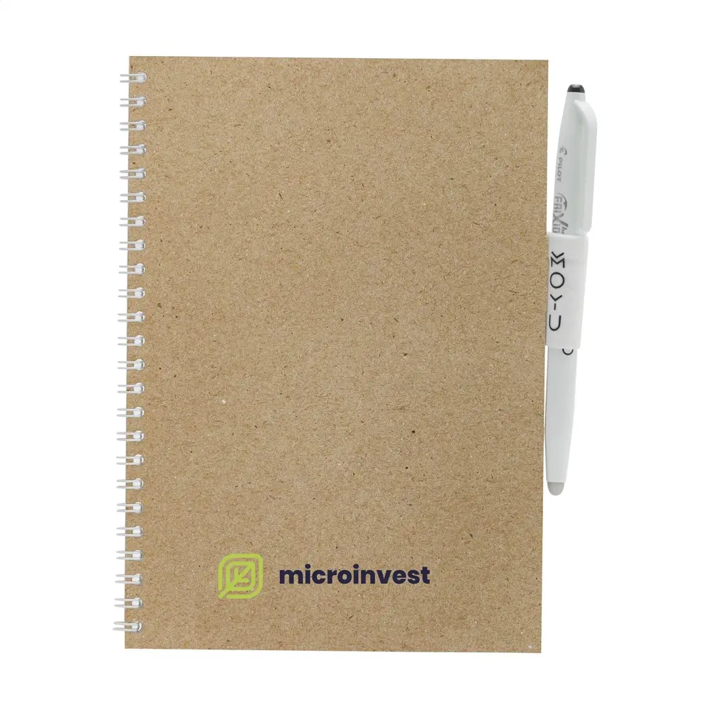 Als marketingprofessional of eventorganisator bereikt u met dit notitieboek een breed publiek. Personaliseer het met uw logo via tampondruk of lasergravure, voor een blijvende indruk. Het combineert gebruiksgemak met ecologische waarde, wat uw merkloyaliteit verhoogt en bijdraagt aan een groener profiel. Bestel in grote aantallen en inspireer uw relaties met een innovatief, herbruikbaar geschenk.