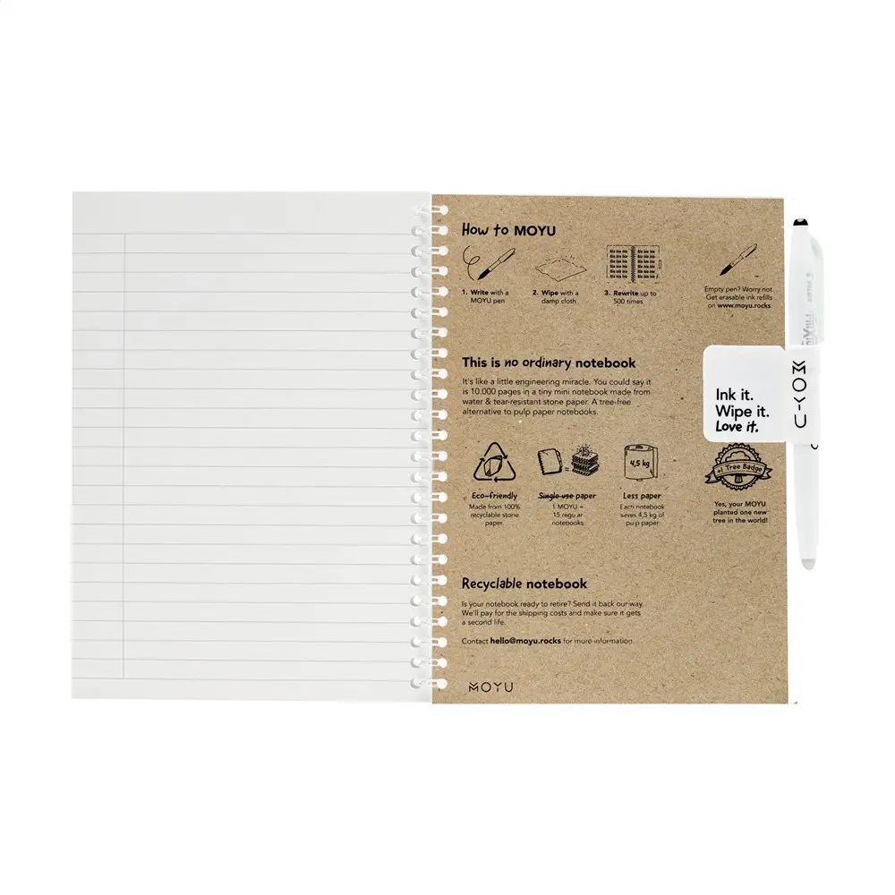 Ontdek het MOYU Uitwisbaar A5-notitieboek van steenpapier met stevige cover van gerecycled kraftkarton. Dit duurzame relatiegeschenk bevat een speciale pen met Frixion-inkt en een schoonmaakdoekje, ideaal voor herhaalde notities. Elke pagina is boomvrij, 100% recyclebaar en tot 500 keer herschrijfbaar zonder sporen. Wis eenvoudig met een vochtig doekje voor nieuwe ideeën.