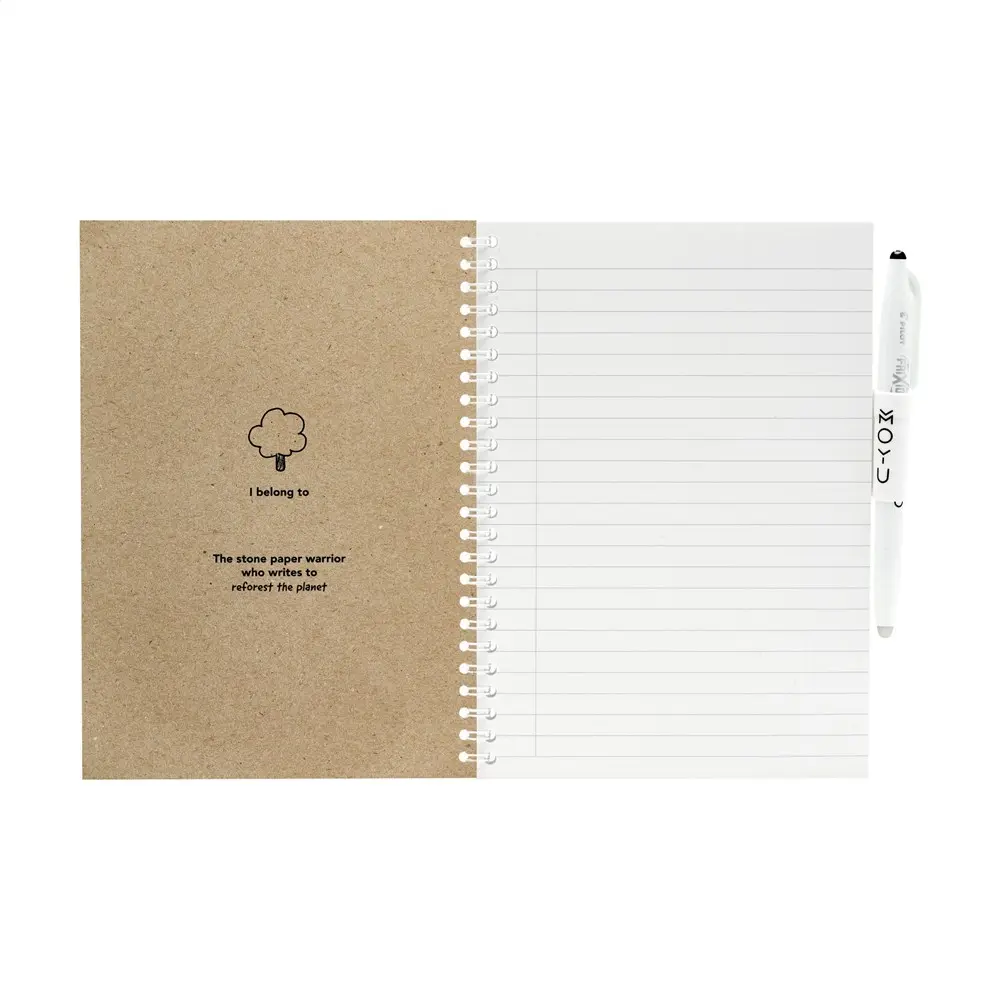 Ontdek ons uitwisbare A5-notitieboek van steenpapier, ideaal als gepersonaliseerd relatiegeschenk voor uw bedrijf. Met een stevige cover van gerecycled kraftkarton biedt dit notitieboek een professionele uitstraling, perfect voor events en promotiecampagnes. Inclusief een speciale pen en schoonmaakdoekje, zodat uw relaties direct aan de slag kunnen.
