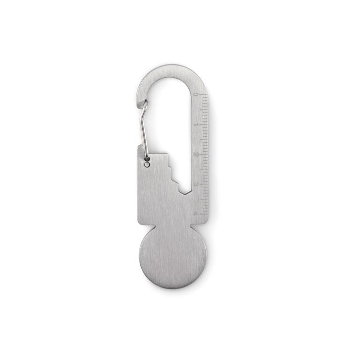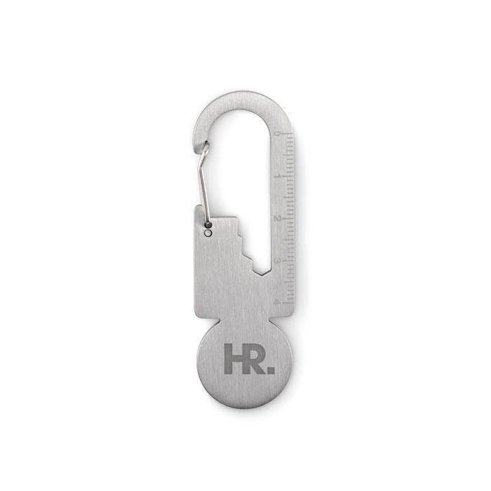 Ontdek de MULTIKEY - Multifunctionele sleutelhanger, jouw ideale relatiegeschenk gemaakt van gerecycled roestvrij staal. Dit handig winkelwagenmuntje combineert een flesopener, liniaal en inbussleutels van 5,5 mm, 7 mm en 8 mm in één compact ontwerp.